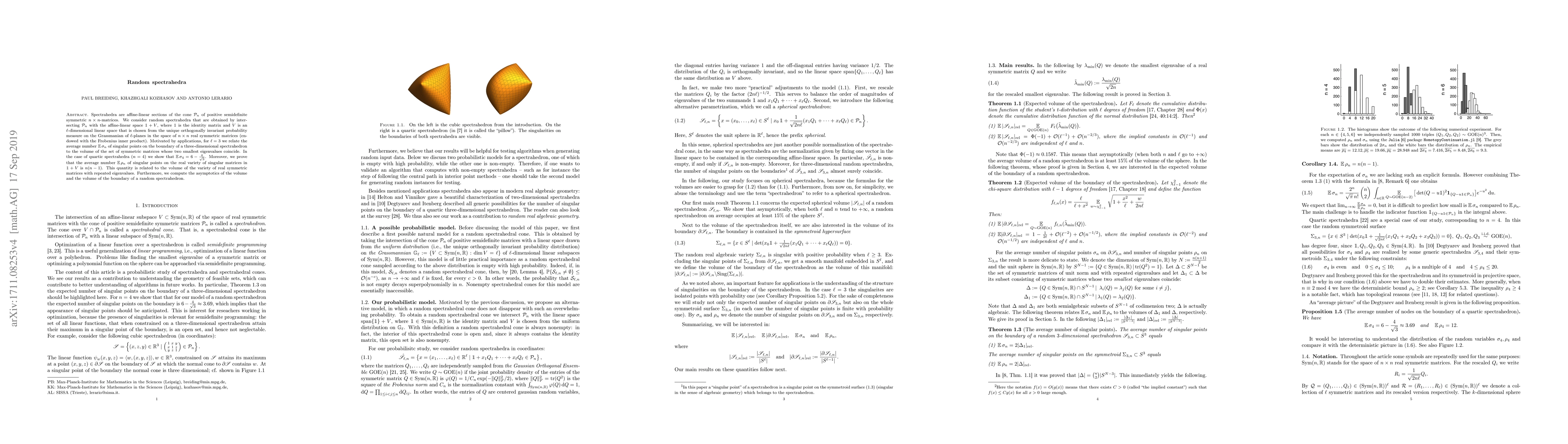 Spectrahedra are affine-linear sections of the cone $\mathcal{P}_n$ of positive semidefinite symmetric $n\times n$-matrices. We consider random spectrahedra that are obtained by intersecting~$\mathcal{P}_n$ with the affine-linear space $\mathbf{1} + V$, where $\mathbf{1}$ is the identity matrix and $V$ is an $\ell$-dimensional linear space that is chosen from the unique orthogonally invariant probability measure on the Grassmanian of $\ell$-planes in the space of $n\times n$ real symmetric matrices (endowed with the Frobenius inner product). Motivated by applications, for $\ell=3$ we relate the average number $\mathbb{E} \sigma_n$ of singular points on the boundary of a three-dimensional spectrahedron to the volume of the set of symmetric matrices whose two smallest eigenvalues coincide. In the case of quartic spectrahedra ($n=4$) we show that $\mathbb{E} \sigma_4 = 6-\frac{4}{\sqrt{3}}$. Moreover, we prove that the average number $\mathbb{E} \rho_n$ of singular points on the real variety of singular matrices in $\mathbf{1} + V$ is $n(n-1)$. This quantity is related to the volume of the variety of real symmetric matrices with repeated eigenvalues. Furthermore, we compute the asymptotics of the volume and the volume of the boundary of a random spectrahedron.
