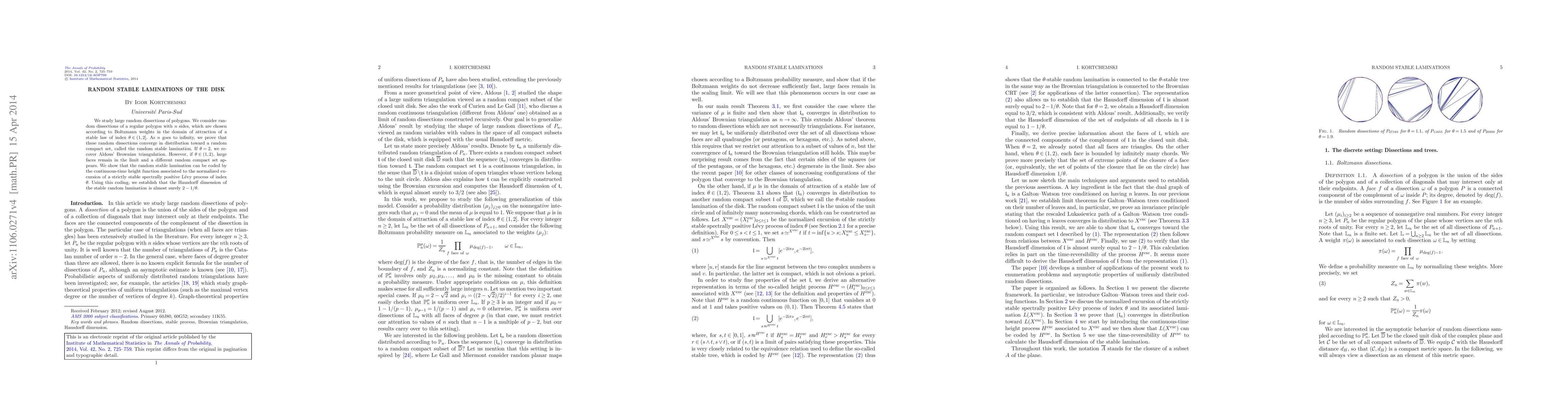 Researchers studied random dissections of polygons and found that as n approaches infinity, they converge to a random compact set called the stable lamination. This set has a Hausdorff dimension of 2-1/θ, where θ is between 1 and 2.