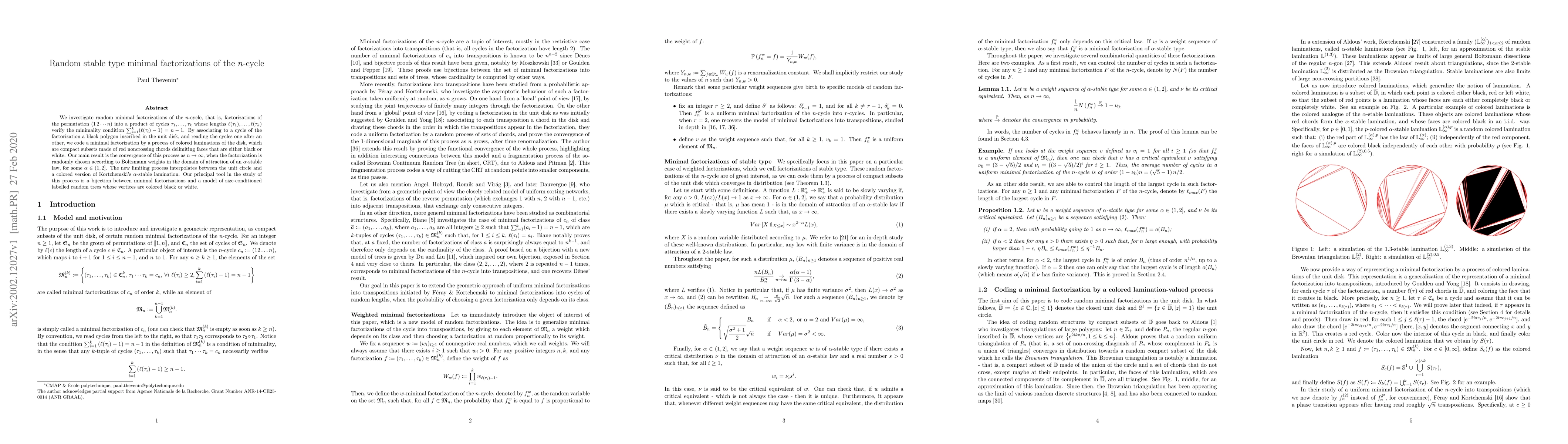 This paper studies random minimal factorizations of the $n$-cycle permutation into cycles, showing their convergence to a limiting process as $n$ grows large. The convergence occurs under Boltzmann weights influenced by an $\alpha$-stable law, resulting in a new limiting process that interpolates between the unit circle and a colored stable lamination.