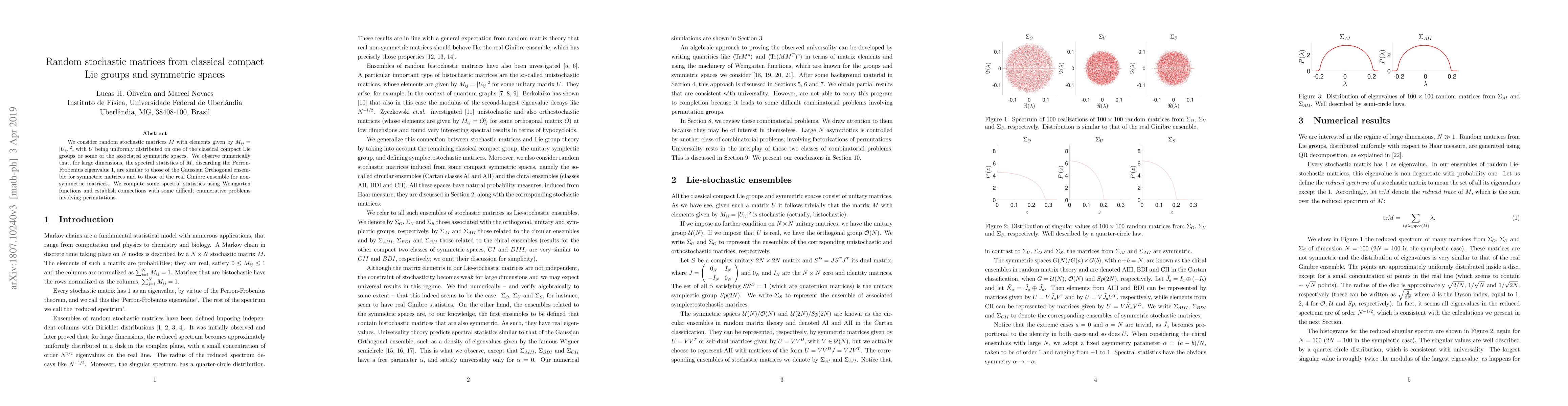 We consider random stochastic matrices $M$ with elements given by $M_{ij}=|U_{ij}|^2$, with $U$ being uniformly distributed on one of the classical compact Lie groups or associated symmetric spaces. We observe numerically that, for large dimensions, the spectral statistics of $M$, discarding the Perron-Frobenius eigenvalue $1$, are similar to those of the Gaussian Orthogonal ensemble for symmetric matrices and to those of the real Ginibre ensemble for non-symmetric matrices. Using Weingarten functions, we compute some spectral statistics that corroborate this universality. We also establish connections with some difficult enumerative problems involving permutations.
