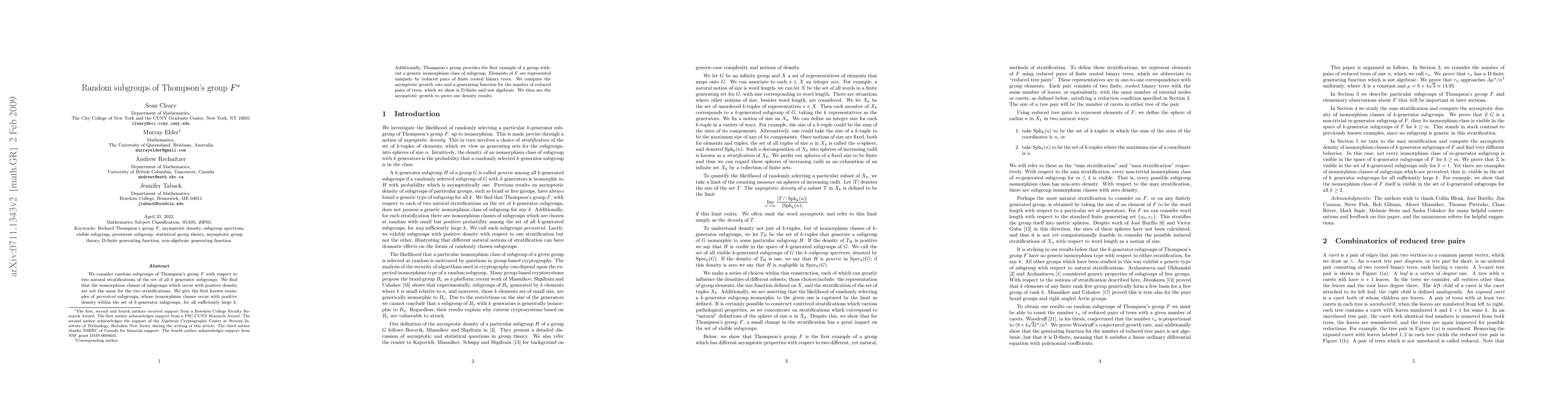 We consider random subgroups of Thompson's group $F$ with respect to two natural stratifications of the set of all $k$ generator subgroups. We find that the isomorphism classes of subgroups which occur with positive density are not the same for the two stratifications. We give the first known examples of {\em persistent} subgroups, whose isomorphism classes occur with positive density within the set of $k$-generator subgroups, for all sufficiently large $k$. Additionally, Thompson's group provides the first example of a group without a generic isomorphism class of subgroup. Elements of $F$ are represented uniquely by reduced pairs of finite rooted binary trees. We compute the asymptotic growth rate and a generating function for the number of reduced pairs of trees, which we show is D-finite and not algebraic. We then use the asymptotic growth to prove our density results.