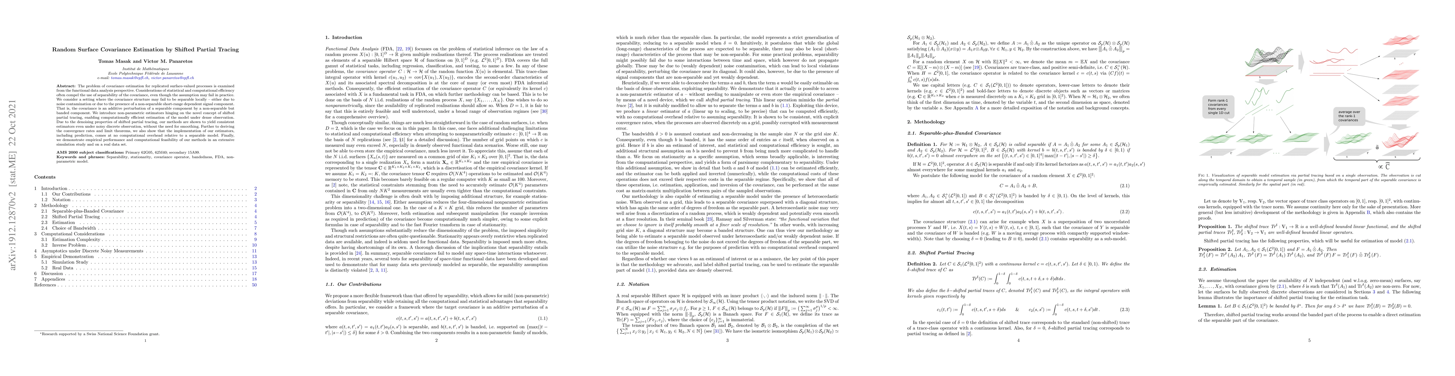 The problem of covariance estimation for replicated surface-valued processes is examined from the functional data analysis perspective. Considerations of statistical and computational efficiency often compel the use of separability of the covariance, even though the assumption may fail in practice. We consider a setting where the covariance structure may fail to be separable locally -- either due to noise contamination or due to the presence of a~non-separable short-range dependent signal component. That is, the covariance is an additive perturbation of a separable component by a~non-separable but banded component. We introduce non-parametric estimators hinging on the novel concept of shifted partial tracing, enabling computationally efficient estimation of the model under dense observation. Due to the denoising properties of shifted partial tracing, our methods are shown to yield consistent estimators even under noisy discrete observation, without the need for smoothing. Further to deriving the convergence rates and limit theorems, we also show that the implementation of our estimators, including prediction, comes at no computational overhead relative to a separable model. Finally, we demonstrate empirical performance and computational feasibility of our methods in an extensive simulation study and on a real data set.