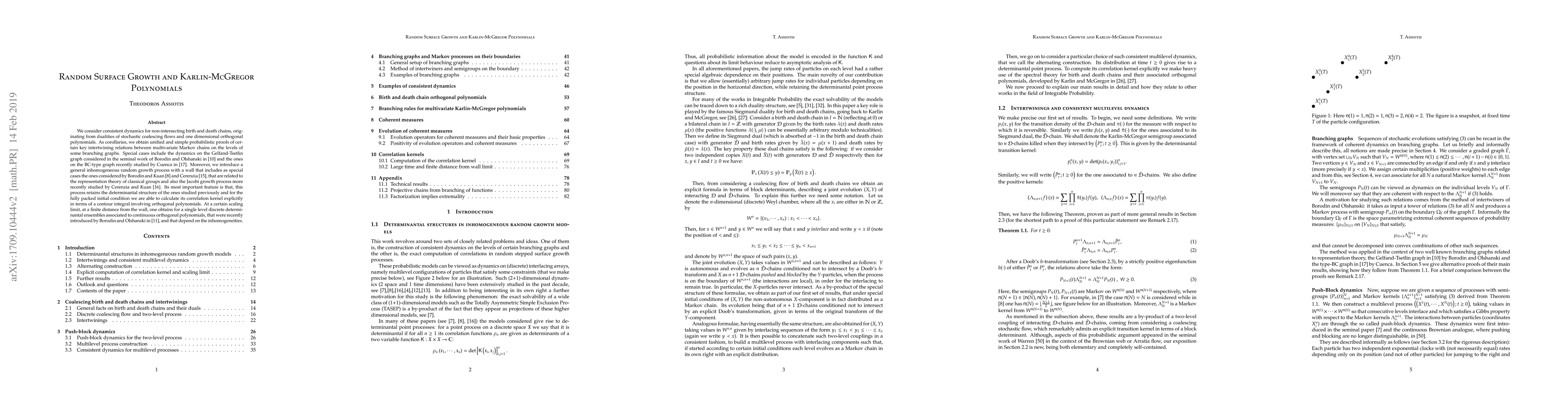 We consider consistent dynamics for non-intersecting birth and death chains, originating from dualities of stochastic coalescing flows and one dimensional orthogonal polynomials. As corollaries, we obtain unified and simple probabilistic proofs of certain key intertwining relations between multivariate Markov chains on the levels of some branching graphs. Special cases include the dynamics on the Gelfand-Tsetlin graph considered by Borodin and Olshanski and the ones on the BC-type graph recently studied by Cuenca. Moreover, we introduce a general inhomogeneous random growth process with a wall that includes as special cases the ones considered by Borodin and Kuan and Cerenzia, that are related to the representation theory of classical groups and also the Jacobi growth process more recently studied by Cerenzia and Kuan. Its most important feature is that, this process retains the determinantal structure of the ones studied previously and for the fully packed initial condition we are able to calculate its correlation kernel explicitly in terms of a contour integral involving orthogonal polynomials. At a certain scaling limit, at a finite distance from the wall, one obtains for a single level discrete determinantal ensembles associated to continuous orthogonal polynomials, that were recently introduced by Borodin and Olshanski, and that depend on the inhomogeneities.