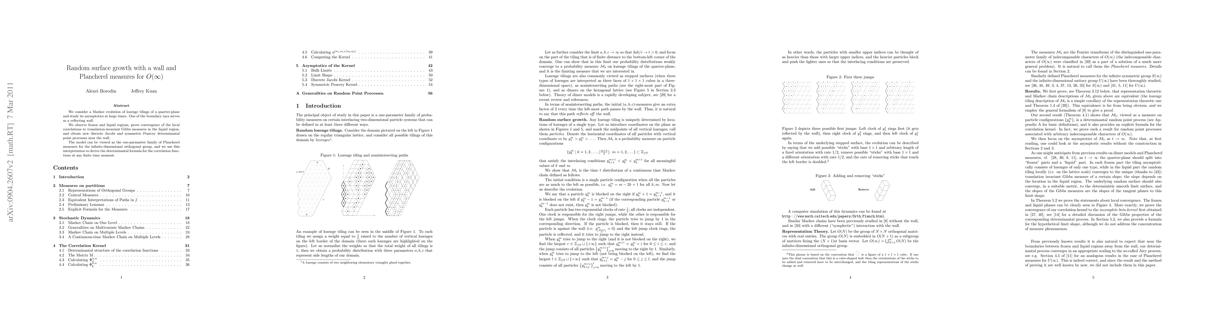 We consider a Markov evolution of lozenge tilings of a quarter-plane and study its asymptotics at large times. One of the boundary rays serves as a reflecting wall. We observe frozen and liquid regions, prove convergence of the local correlations to translation-invariant Gibbs measures in the liquid region, and obtain new discrete Jacobi and symmetric Pearcey determinantal point processes near the wall. The model can be viewed as the one-parameter family of Plancherel measures for the infinite-dimensional orthogonal group, and we use this interpretation to derive the determinantal formula for the correlation functions at any finite time moment.