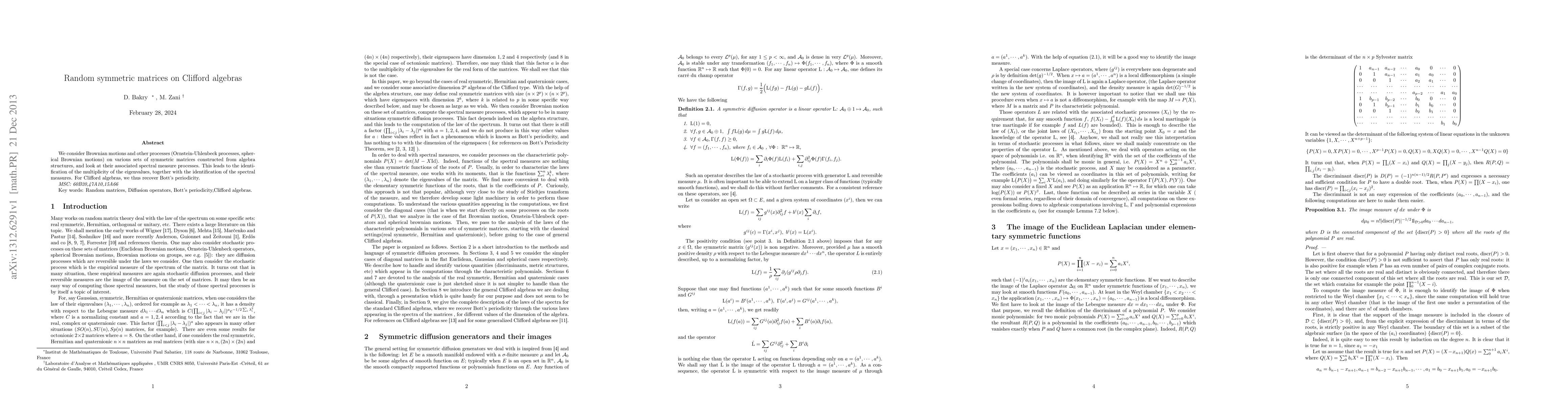 We consider Brownian motions and other processes (Ornstein-Uhlenbeck processes, spherical Brownian motions) on various sets of symmetric matrices constructed from algebra structures, and look at their associated spectral measure processes. This leads to the identification of the multiplicity of the eigenvalues, together with the identification of the spectral measures. For Clifford algebras, we thus recover Bott's periodicity.