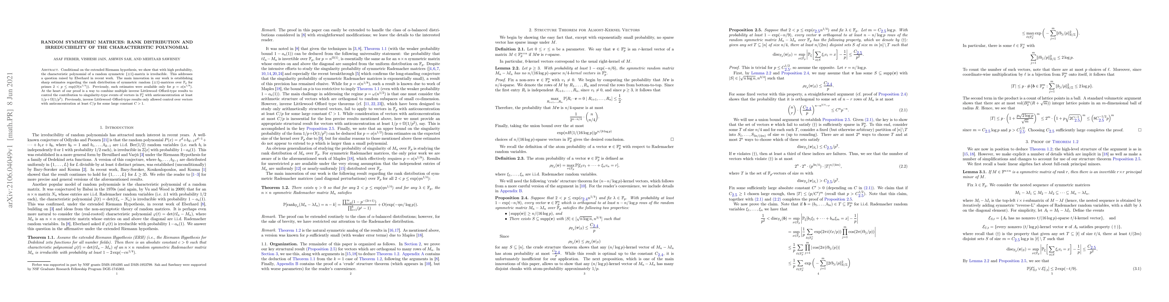 Conditional on the extended Riemann hypothesis, we show that with high probability, the characteristic polynomial of a random symmetric $\{\pm 1\}$-matrix is irreducible. This addresses a question raised by Eberhard in recent work. The main innovation in our work is establishing sharp estimates regarding the rank distribution of symmetric random $\{\pm 1\}$-matrices over $\mathbb{F}_p$ for primes $2 < p \leq \exp(O(n^{1/4}))$. Previously, such estimates were available only for $p = o(n^{1/8})$. At the heart of our proof is a way to combine multiple inverse Littlewood--Offord-type results to control the contribution to singularity-type events of vectors in $\mathbb{F}_p^{n}$ with anticoncentration at least $1/p + \Omega(1/p^2)$. Previously, inverse Littlewood--Offord-type results only allowed control over vectors with anticoncentration at least $C/p$ for some large constant $C > 1$.