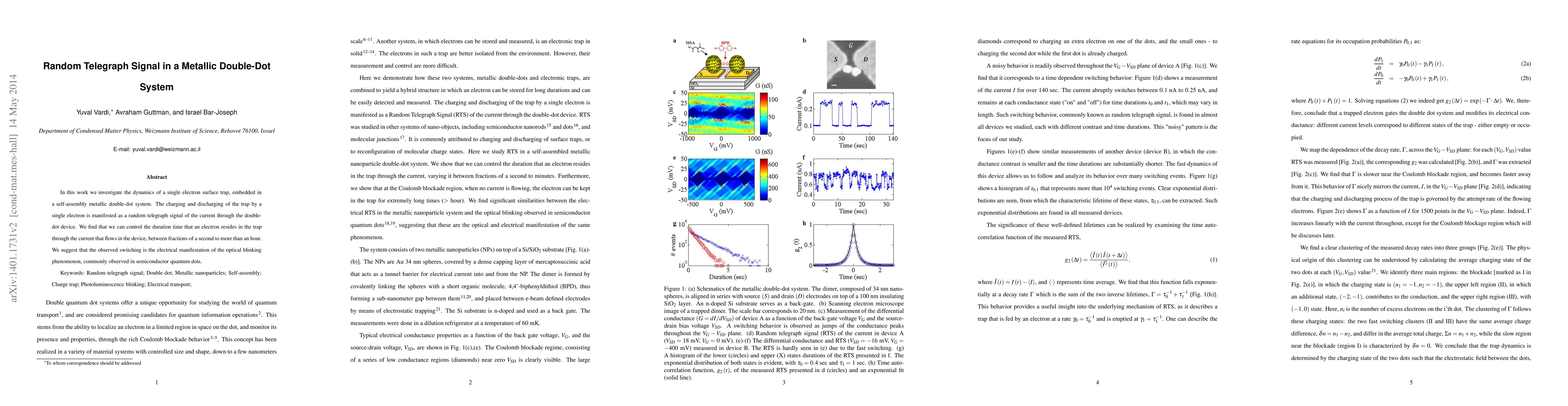 In this work, we investigate the dynamics of a single electron surface trap, embedded in a self-assembly metallic double-dot system. The charging and discharging of the trap by a single electron is manifested as a random telegraph signal of the current through the double-dot device. We find that we can control the duration time that an electron resides in the trap through the current that flows in the device, between fractions of a second to more than an hour. We suggest that the observed switching is the electrical manifestation of the optical blinking phenomenon, commonly observed in semiconductor quantum dots.