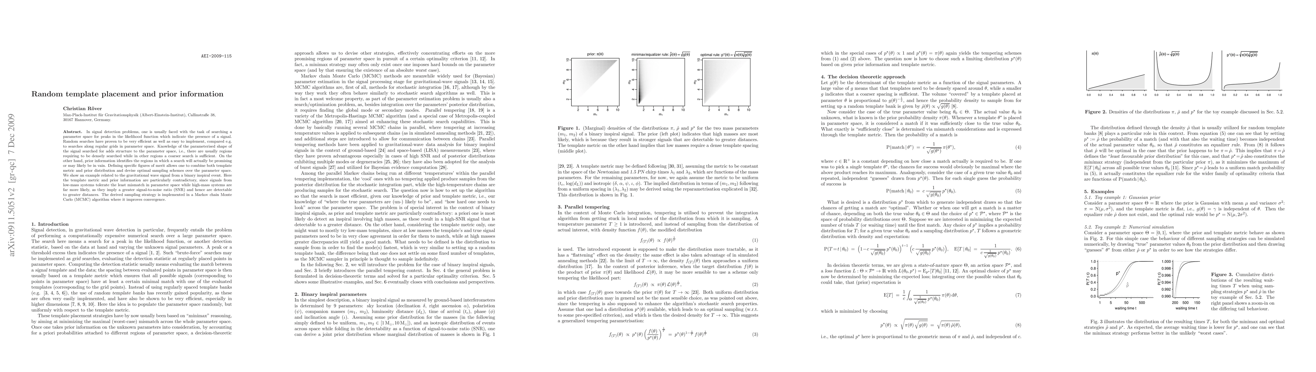 In signal detection problems, one is usually faced with the task of searching a parameter space for peaks in the likelihood function which indicate the presence of a signal. Random searches have proven to be very efficient as well as easy to implement, compared e.g. to searches along regular grids in parameter space. Knowledge of the parameterised shape of the signal searched for adds structure to the parameter space, i.e., there are usually regions requiring to be densely searched while in other regions a coarser search is sufficient. On the other hand, prior information identifies the regions in which a search will actually be promising or may likely be in vain. Defining specific figures of merit allows one to combine both template metric and prior distribution and devise optimal sampling schemes over the parameter space. We show an example related to the gravitational wave signal from a binary inspiral event. Here the template metric and prior information are particularly contradictory, since signals from low-mass systems tolerate the least mismatch in parameter space while high-mass systems are far more likely, as they imply a greater signal-to-noise ratio (SNR) and hence are detectable to greater distances. The derived sampling strategy is implemented in a Markov chain Monte Carlo (MCMC) algorithm where it improves convergence.