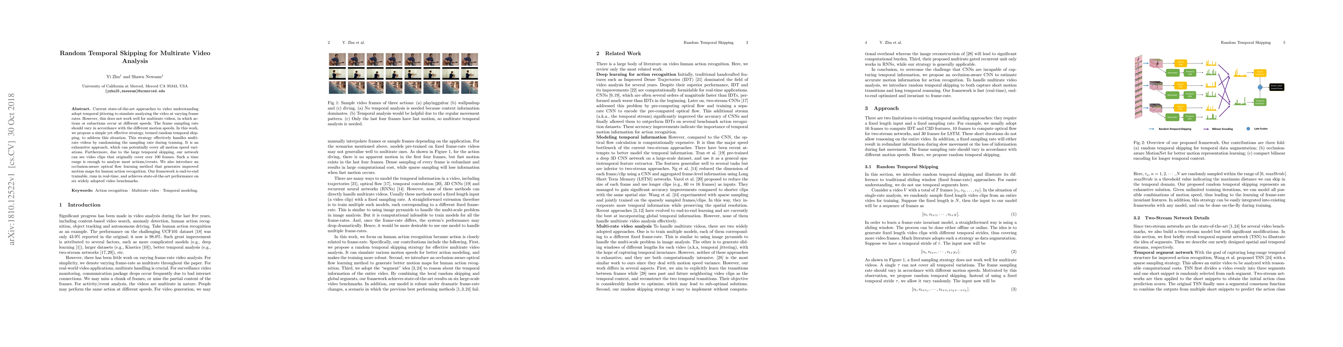Current state-of-the-art approaches to video understanding adopt temporal jittering to simulate analyzing the video at varying frame rates. However, this does not work well for multirate videos, in which actions or subactions occur at different speeds. The frame sampling rate should vary in accordance with the different motion speeds. In this work, we propose a simple yet effective strategy, termed random temporal skipping, to address this situation. This strategy effectively handles multirate videos by randomizing the sampling rate during training. It is an exhaustive approach, which can potentially cover all motion speed variations. Furthermore, due to the large temporal skipping, our network can see video clips that originally cover over 100 frames. Such a time range is enough to analyze most actions/events. We also introduce an occlusion-aware optical flow learning method that generates improved motion maps for human action recognition. Our framework is end-to-end trainable, runs in real-time, and achieves state-of-the-art performance on six widely adopted video benchmarks.