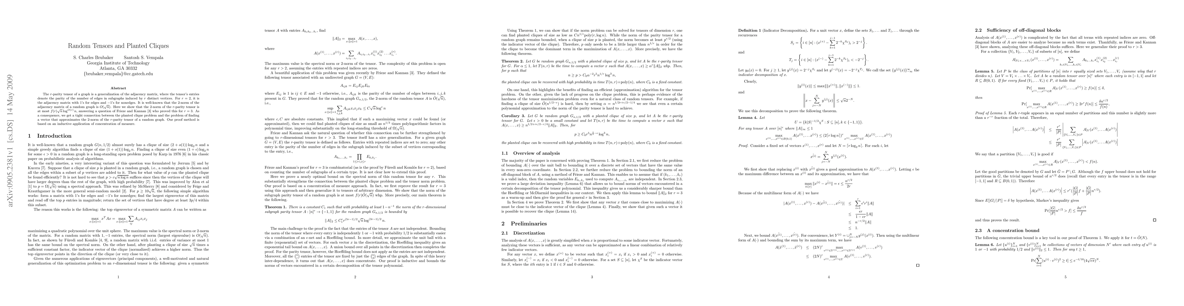The r-parity tensor of a graph is a generalization of the adjacency matrix, where the tensor's entries denote the parity of the number of edges in subgraphs induced by r distinct vertices. For r=2, it is the adjacency matrix with 1's for edges and -1's for nonedges. It is well-known that the 2-norm of the adjacency matrix of a random graph is O(\sqrt{n}). Here we show that the 2-norm of the r-parity tensor is at most f(r)\sqrt{n}\log^{O(r)}n, answering a question of Frieze and Kannan who proved this for r=3. As a consequence, we get a tight connection between the planted clique problem and the problem of finding a vector that approximates the 2-norm of the r-parity tensor of a random graph. Our proof method is based on an inductive application of concentration of measure.
