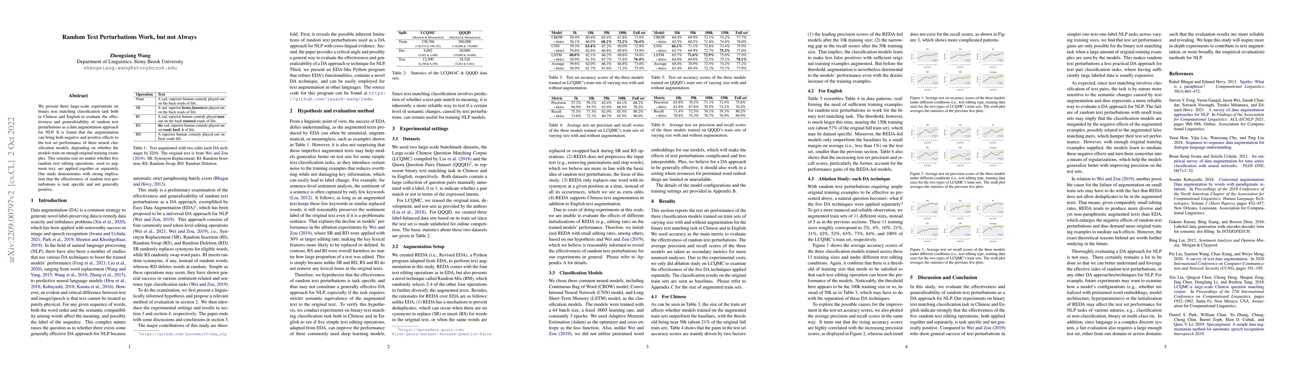 We present three large-scale experiments on binary text matching classification task both in Chinese and English to evaluate the effectiveness and generalizability of random text perturbations as a data augmentation approach for NLP. It is found that the augmentation can bring both negative and positive effects to the test set performance of three neural classification models, depending on whether the models train on enough original training examples. This remains true no matter whether five random text editing operations, used to augment text, are applied together or separately. Our study demonstrates with strong implication that the effectiveness of random text perturbations is task specific and not generally positive.