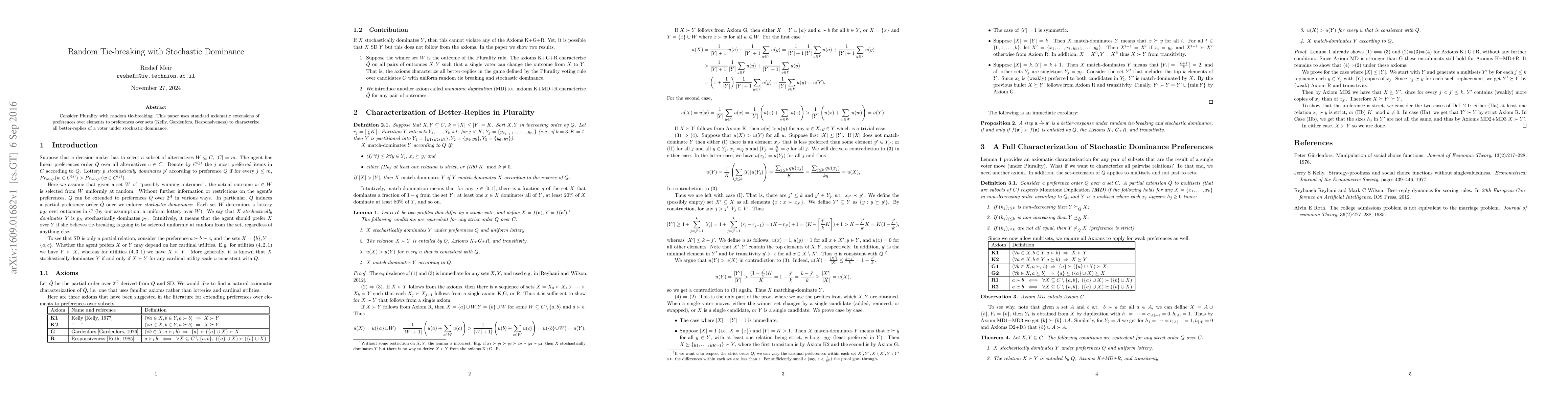 This paper uses axiomatic extensions of preferences to characterize better-replies under stochastic dominance in Plurality voting with random tie-breaking. It provides a framework for analyzing voter behavior in uncertain elections.