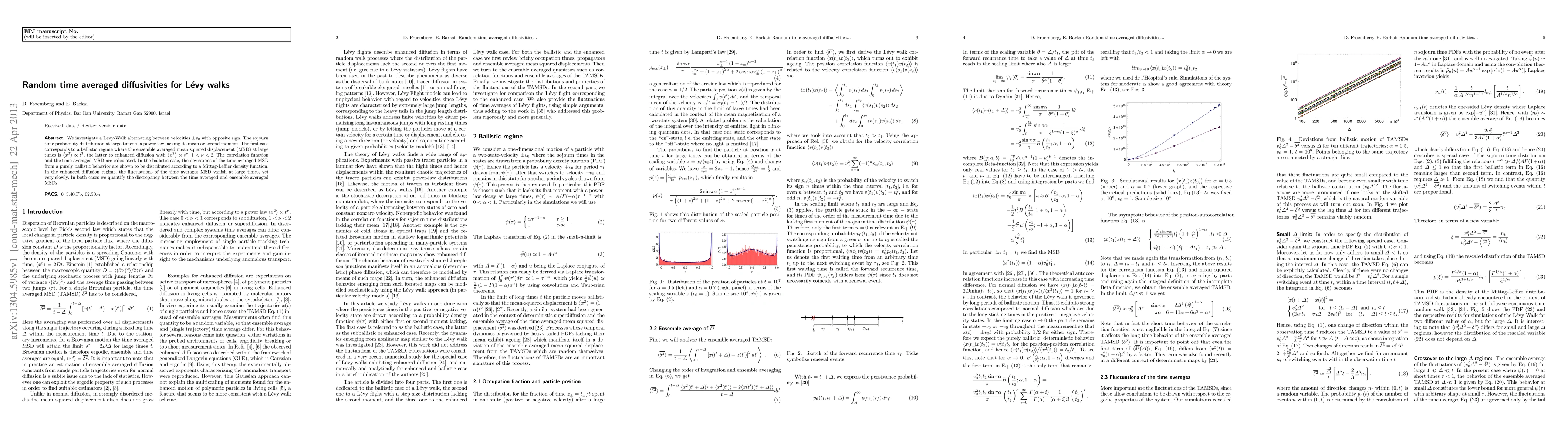 We investigate a L\'evy-Walk alternating between velocities $\pm v_0$ with opposite sign. The sojourn time probability distribution at large times is a power law lacking its mean or second moment. The first case corresponds to a ballistic regime where the ensemble averaged mean squared displacement (MSD) at large times is $< x^2 > \propto t^2$, the latter to enhanced diffusion with $< x^2 > \propto t^\nu$, $1<\nu<2$. The correlation function and the time averaged MSD are calculated. In the ballistic case, the deviations of the time averaged MSD from a purely ballistic behavior are shown to be distributed according to a Mittag-Leffler density function. In the enhanced diffusion regime, the fluctuations of the time averages MSD vanish at large times, yet very slowly. In both cases we quantify the discrepancy between the time averaged and ensemble averaged MSDs.