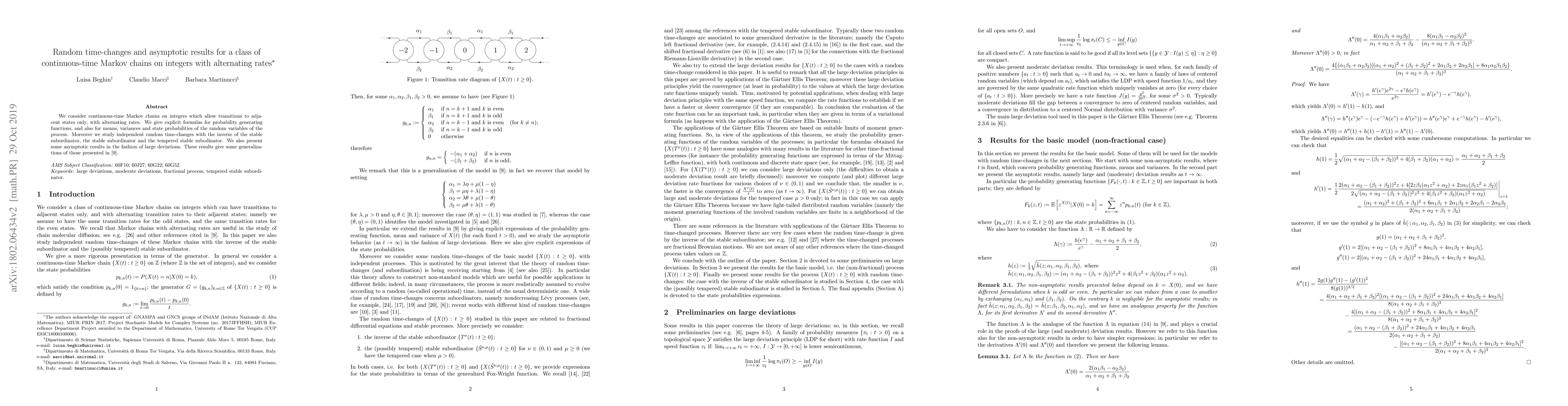 This paper studies continuous-time Markov chains on integers with alternating transition rates, providing explicit formulas for probability generating functions, means, variances, and state probabilities. It also investigates the effects of random time-changes using stable and tempered stable subordinators, and presents asymptotic results in the context of large deviations.