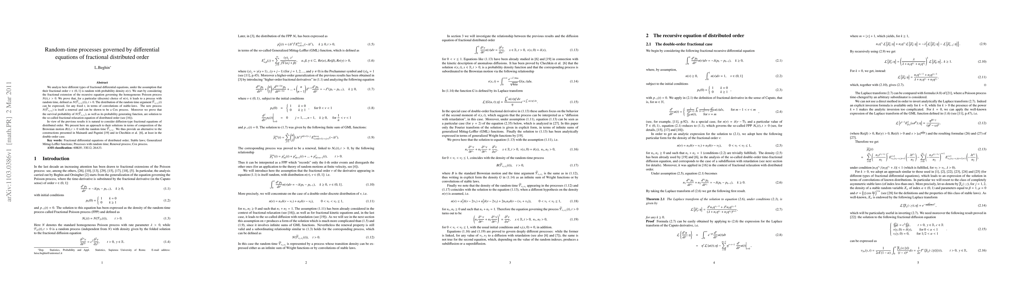We analyze here different types of fractional differential equations, under the assumption that their fractional order $\nu \in (0,1] $ is random\ with probability density $n(\nu).$ We start by considering the fractional extension of the recursive equation governing the homogeneous Poisson process $N(t),t>0.$\ We prove that, for a particular (discrete) choice of $n(\nu)$, it leads to a process with random time, defined as $N(% \widetilde{\mathcal{T}}_{\nu_{1,}\nu_{2}}(t)),t>0.$ The distribution of the random time argument $\widetilde{\mathcal{T}}_{\nu_{1,}\nu_{2}}(t)$ can be expressed, for any fixed $t$, in terms of convolutions of stable-laws. The new process $N(\widetilde{\mathcal{T}}_{\nu_{1,}\nu_{2}})$ is itself a renewal and can be shown to be a Cox process. Moreover we prove that the survival probability of $N(\widetilde{\mathcal{T}}_{\nu_{1,}\nu_{2}})$, as well as its probability generating function, are solution to the so-called fractional relaxation equation of distributed order (see \cite{Vib}%). In view of the previous results it is natural to consider diffusion-type fractional equations of distributed order. We present here an approach to their solutions in terms of composition of the Brownian motion $B(t),t>0$ with the random time $\widetilde{\mathcal{T}}_{\nu_{1,}\nu_{2}}$. We thus provide an alternative to the constructions presented in Mainardi and Pagnini \cite{mapagn} and in Chechkin et al. \cite{che1}, at least in the double-order case.