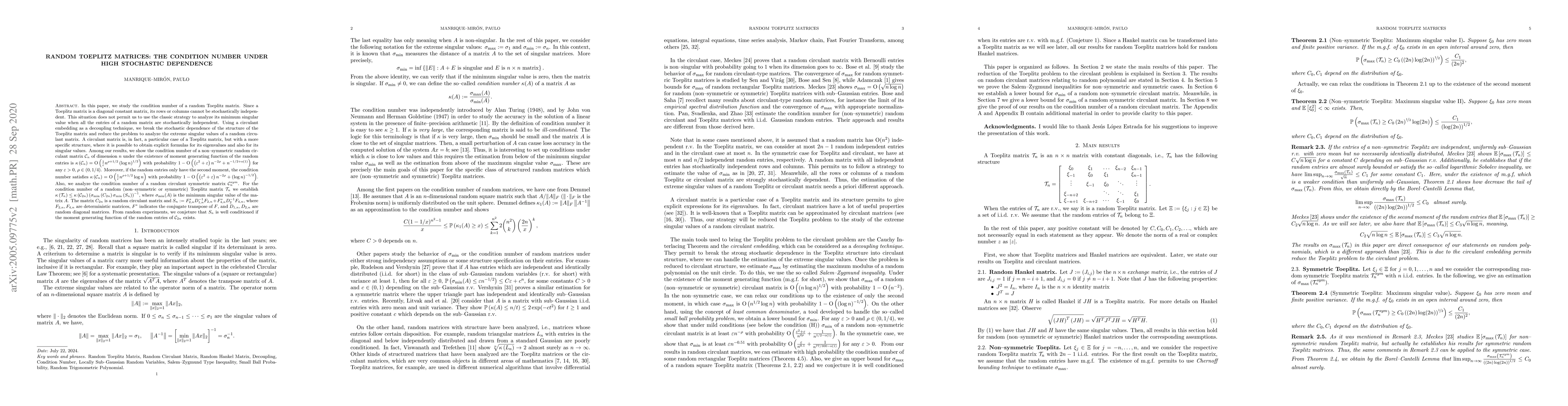 This paper investigates the condition number of a random Toeplitz matrix, addressing the challenge of stochastic dependence in its structure. By employing a circulant embedding technique, the authors analyze the extreme singular values of a random circulant matrix, deriving bounds for the condition number under different moments of the random entries.