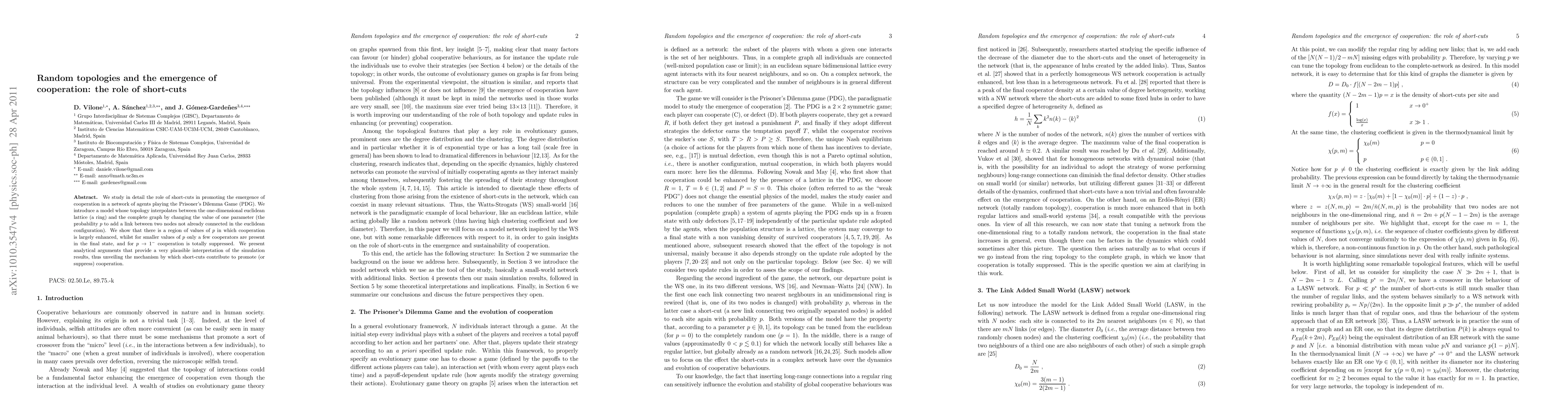 We study in detail the role of short-cuts in promoting the emergence of cooperation in a network of agents playing the Prisoner's Dilemma Game (PDG). We introduce a model whose topology interpolates between the one-dimensional euclidean lattice (a ring) and the complete graph by changing the value of one parameter (the probability p to add a link between two nodes not already connected in the euclidean configuration). We show that there is a region of values of p in which cooperation is largely enhanced, whilst for smaller values of p only a few cooperators are present in the final state, and for p \rightarrow 1- cooperation is totally suppressed. We present analytical arguments that provide a very plausible interpretation of the simulation results, thus unveiling the mechanism by which short-cuts contribute to promote (or suppress) cooperation.