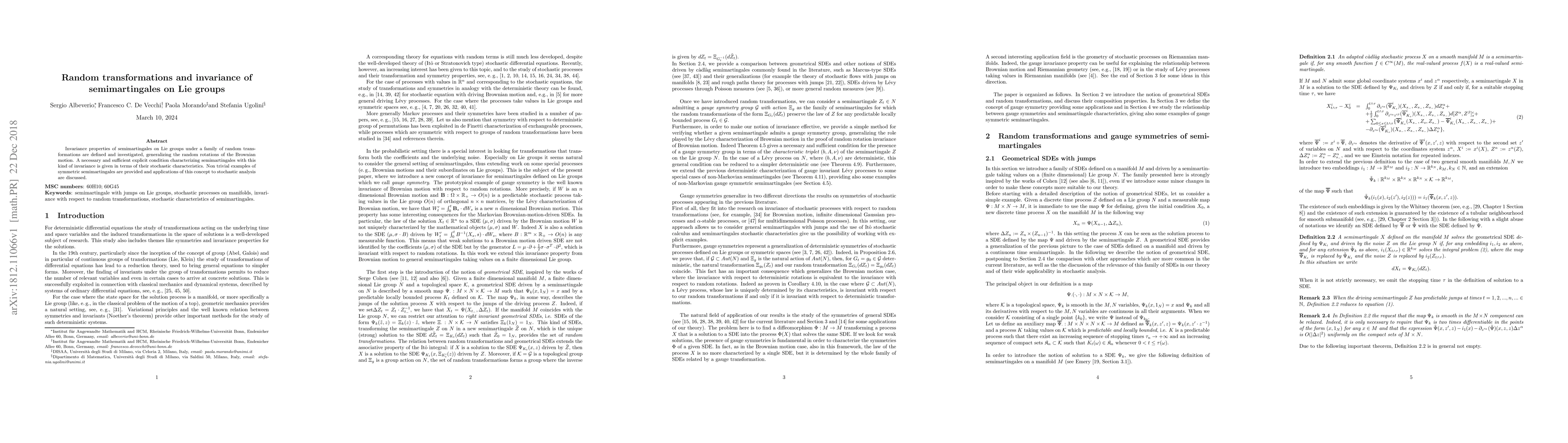 This paper investigates invariance properties of semimartingales on Lie groups under random transformations, generalizing random rotations of Brownian motion. It provides a necessary and sufficient condition for such invariance in terms of the semimartingale's stochastic characteristics, with examples and applications to stochastic analysis.