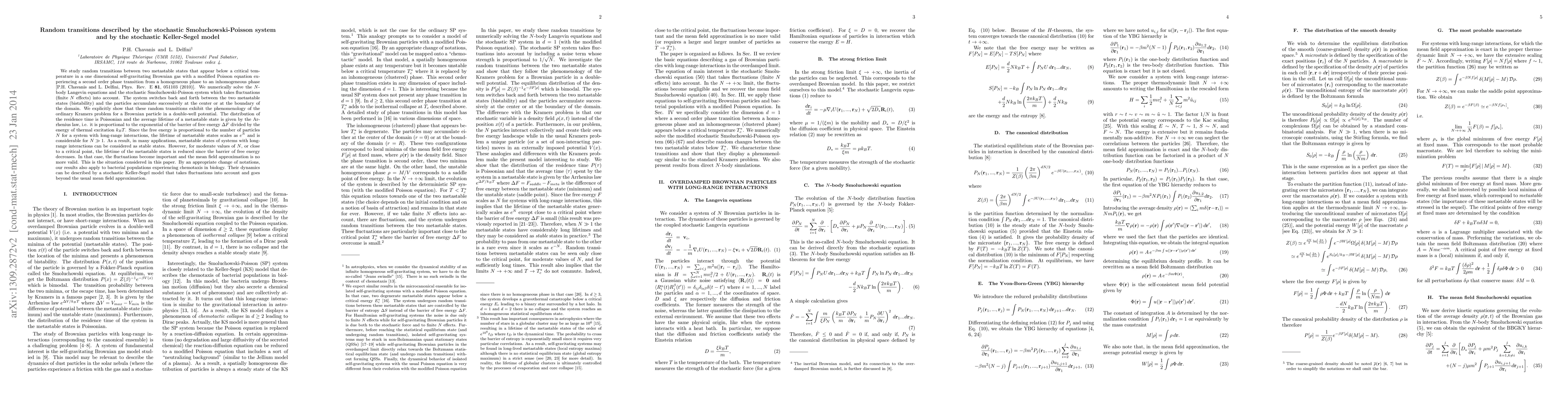 We study random transitions between two metastable states that appear below a critical temperature in a one dimensional self-gravitating Brownian gas with a modified Poisson equation experiencing a second order phase transition from a homogeneous phase to an inhomogeneous phase. We numerically solve the $N$-body Langevin equations and the stochastic Smoluchowski-Poisson system which takes fluctuations (finite $N$ effects) into account. The system switches back and forth between the two metastable states (bistability) and the particles accumulate successively at the center or at the boundary of the domain. We show that these random transitions exhibit the phenomenology of the ordinary Kramers problem for a Brownian particle in a double-well potential. The distribution of the residence time is Poissonian and the average lifetime of a metastable state is given by the Arrhenius law, i.e. it is proportional to the exponential of the barrier of free energy $\Delta F$ divided by $k_B T$. Since the free energy is proportional to the number of particles $N$ for a system with long-range interactions, the lifetime of metastable states scales as $e^N$ and is considerable for $N\gg 1$. As a result, in many applications, metastable states of systems with long-range interactions can be considered as stable states. However, for moderate values of $N$, or close to a critical point $T_c$, the lifetime of the metastable states is reduced since the barrier of free energy decreases. In that case, the fluctuations become important and the mean field approximation is no more valid. This is the situation considered in this paper. By an appropriate change of notations, our results also apply to bacterial populations experiencing chemotaxis in biology. Their dynamics can be described by a stochastic Keller-Segel model that takes fluctuations into account and goes beyond the usual mean field approximation.