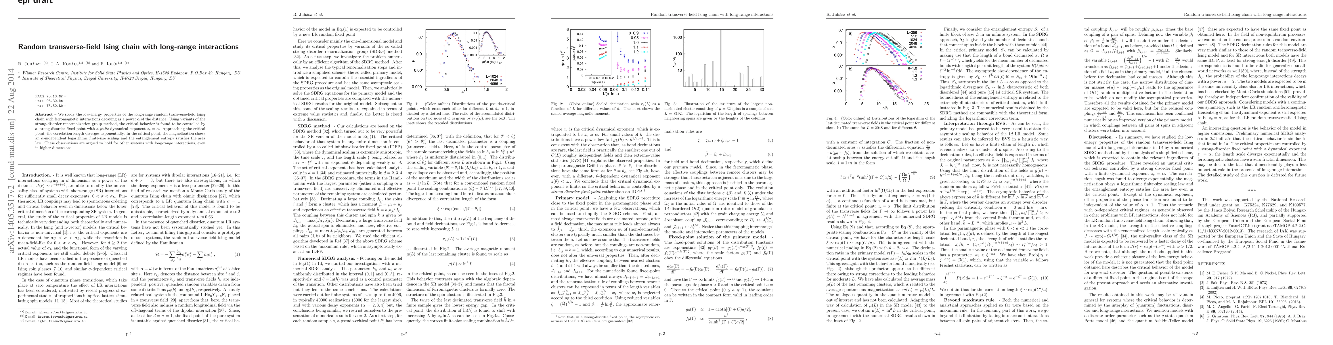 This paper investigates the low-energy properties of a long-range random transverse-field Ising chain, revealing critical behavior governed by a strong-disorder fixed point with a dynamical exponent z_c=alpha. The study finds exponential divergence of the correlation length and logarithmic finite-size scaling of magnetization at the critical point.