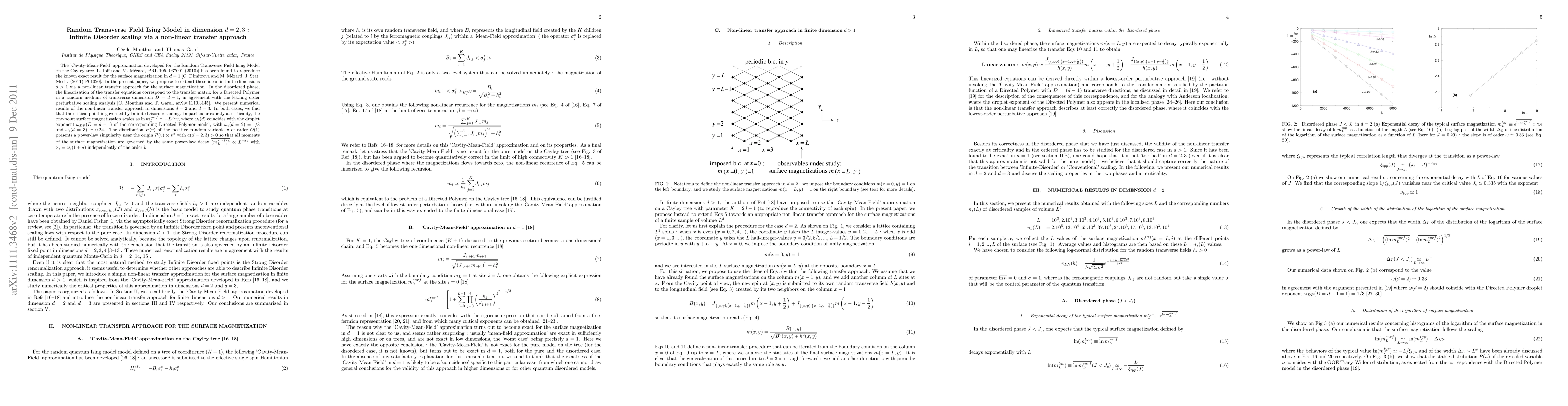 The paper proposes a non-linear transfer approach for the Random Transverse Field Ising Model in dimensions d=2 and 3, finding Infinite Disorder scaling with critical point governed by scaling laws, and power-law singularities in the surface magnetization distribution.