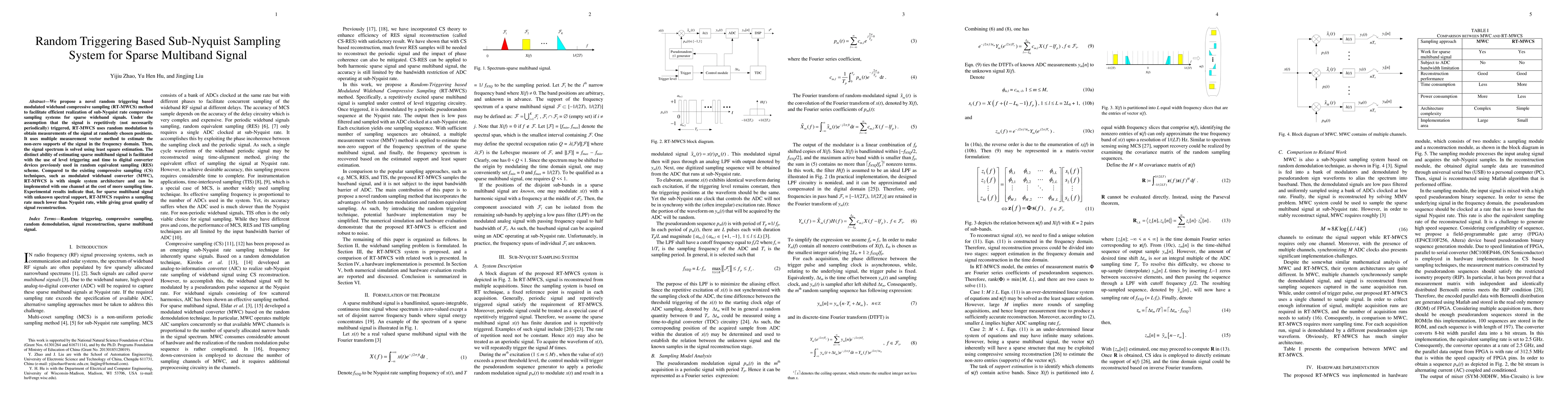 This paper proposes a random triggering based modulated wideband compressive sampling (RT-MWCS) method for efficient sub-Nyquist rate sampling of sparse multiband signals. RT-MWCS uses random modulation and least square estimation to reconstruct signals with lower sampling rates compared to traditional methods.