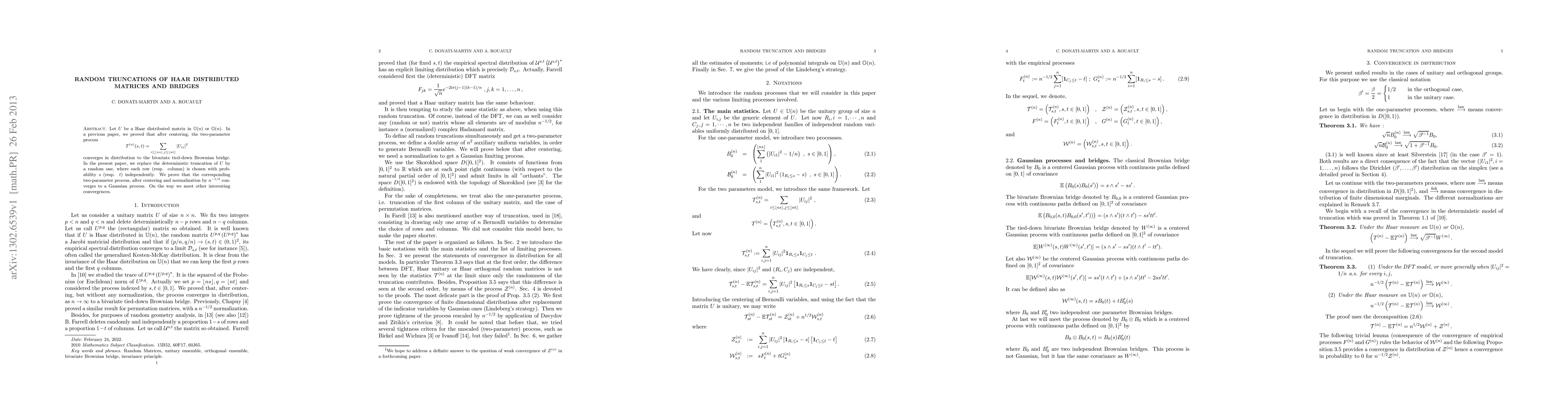 Let $U$ be a Haar distributed matrix in $\mathbb U(n)$ or $\mathbb O (n)$. In a previous paper, we proved that after centering, the two-parameter process \[T^{(n)} (s,t) = \sum_{i \leq \lfloor ns \rfloor, j \leq \lfloor nt\rfloor} |U_{ij}|^2\] converges in distribution to the bivariate tied-down Brownian bridge. In the present paper, we replace the deterministic truncation of $U$ by a random one, where each row (resp. column) is chosen with probability $s$ (resp. $t$) independently. We prove that the corresponding two-parameter process, after centering and normalization by $n^{-1/2}$ converges to a Gaussian process. On the way we meet other interesting convergences.