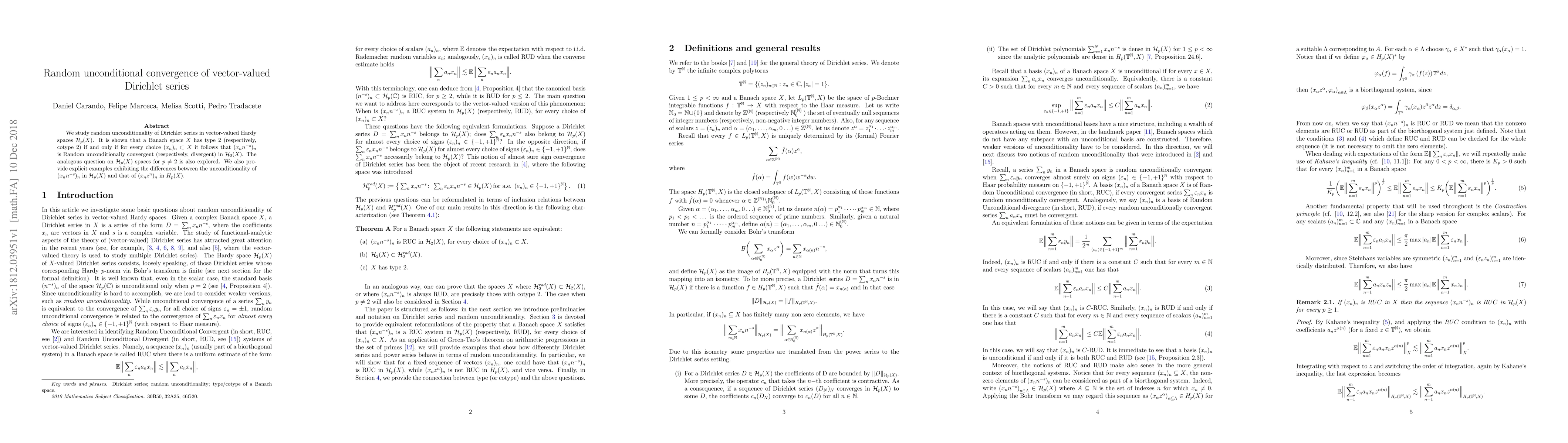 A study on Dirichlet series in vector-valued Hardy spaces shows that a Banach space has type 2 if and only if certain random sequences converge unconditionally, with implications for convergence properties of other sequences.