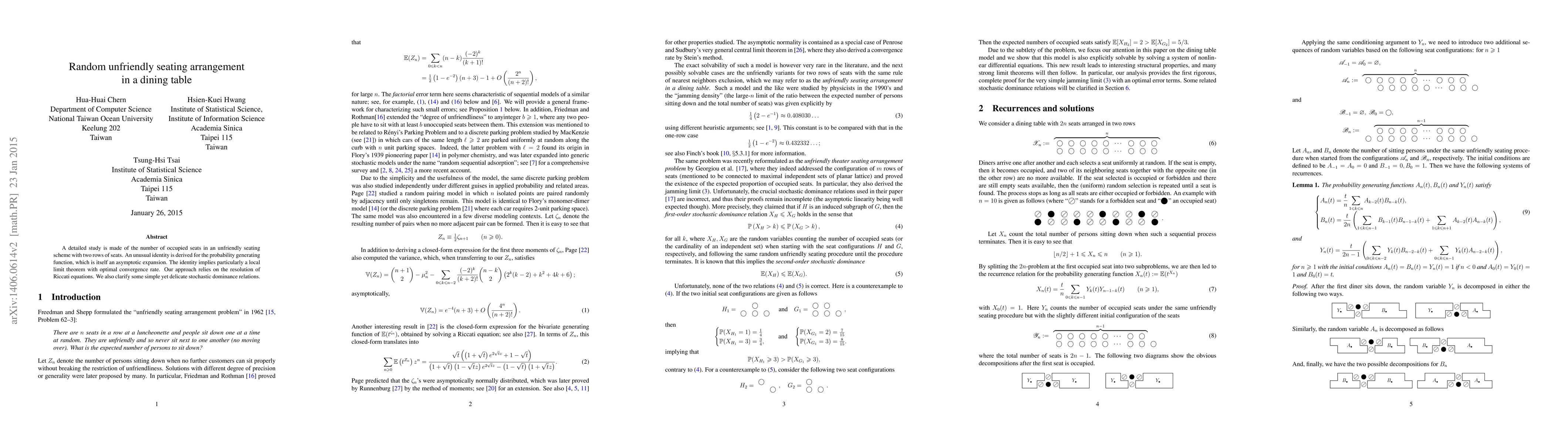 A detailed study is made of the number of occupied seats in an unfriendly seating scheme with two rows of seats. An unusual identity is derived for the probability generating function, which is itself an asymptotic expansion. The identity implies particularly a local limit theorem with optimal convergence rate. Our approach relies on the resolution of Riccati equations.