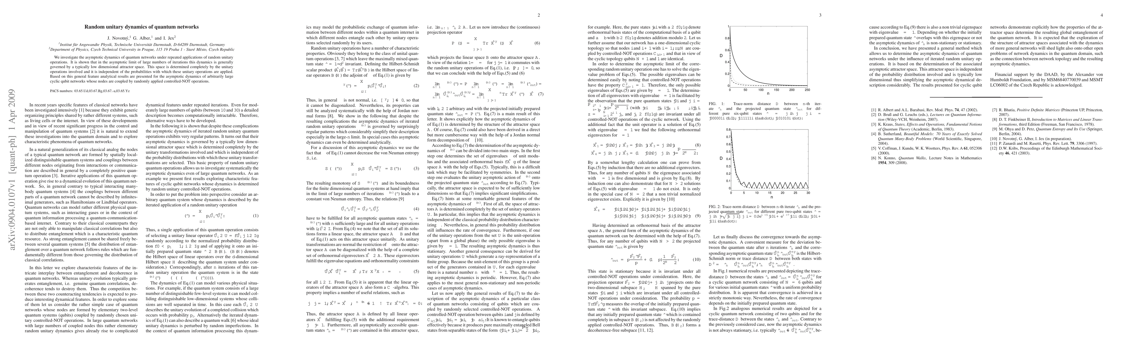 This paper explores the asymptotic behavior of quantum networks subjected to repeated random unitary operations, revealing that the dynamics converge to a low-dimensional attractor space determined solely by the unitary operations, irrespective of their application probabilities. Analytical results are provided for large cyclic qubit networks with randomly applied controlled-NOT operations.