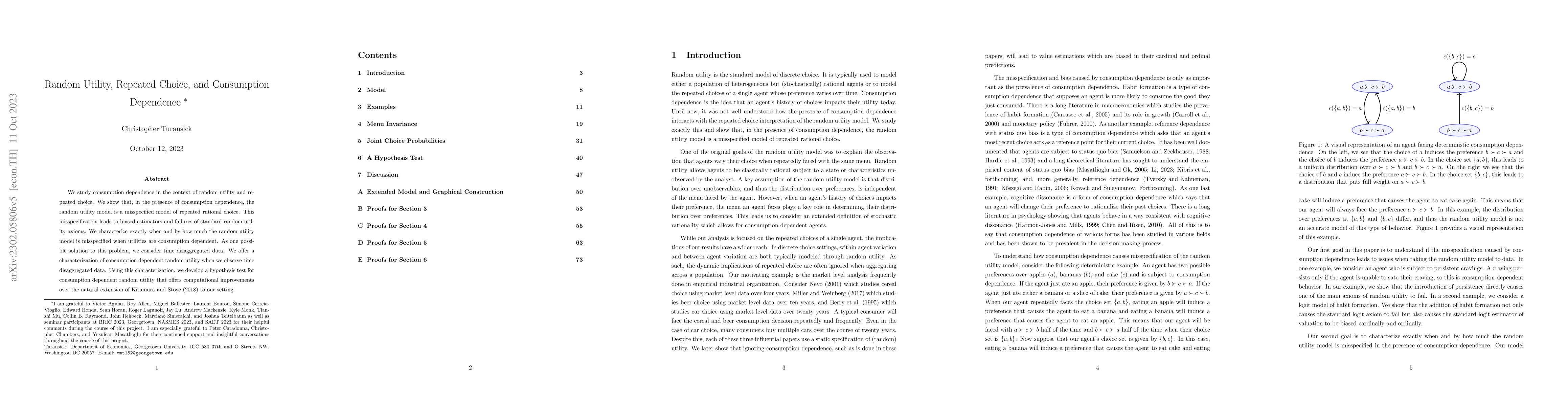 This paper examines how consumption dependence affects the random utility model in repeated rational choice scenarios, demonstrating that it leads to model misspecification, biased estimators, and violations of standard axioms. It proposes using time disaggregated data to better characterize consumption dependent random utility and develops a hypothesis test with improved computational efficiency.