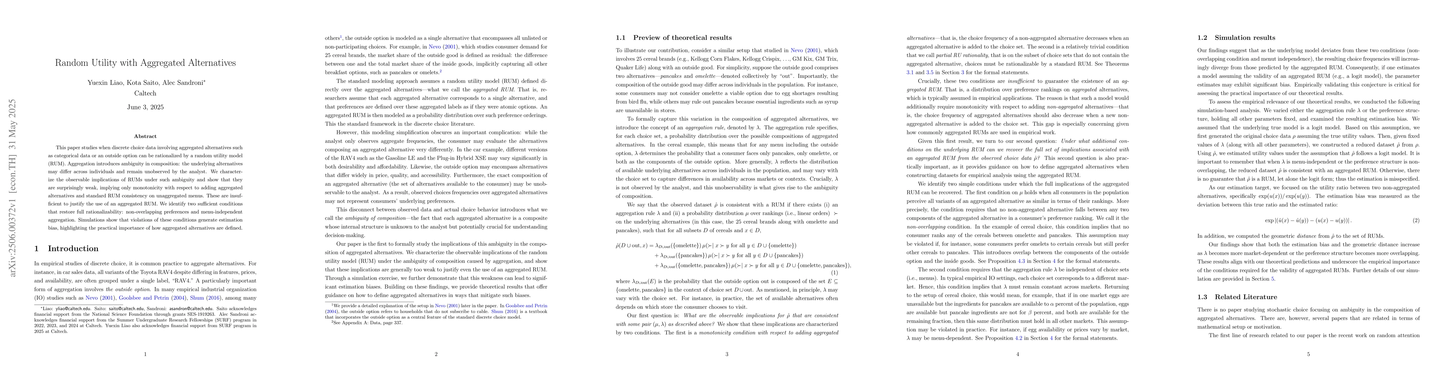 The paper characterizes observable implications of Random Utility Models (RUMs) under ambiguity introduced by aggregated alternatives, using theoretical analysis and simulations.