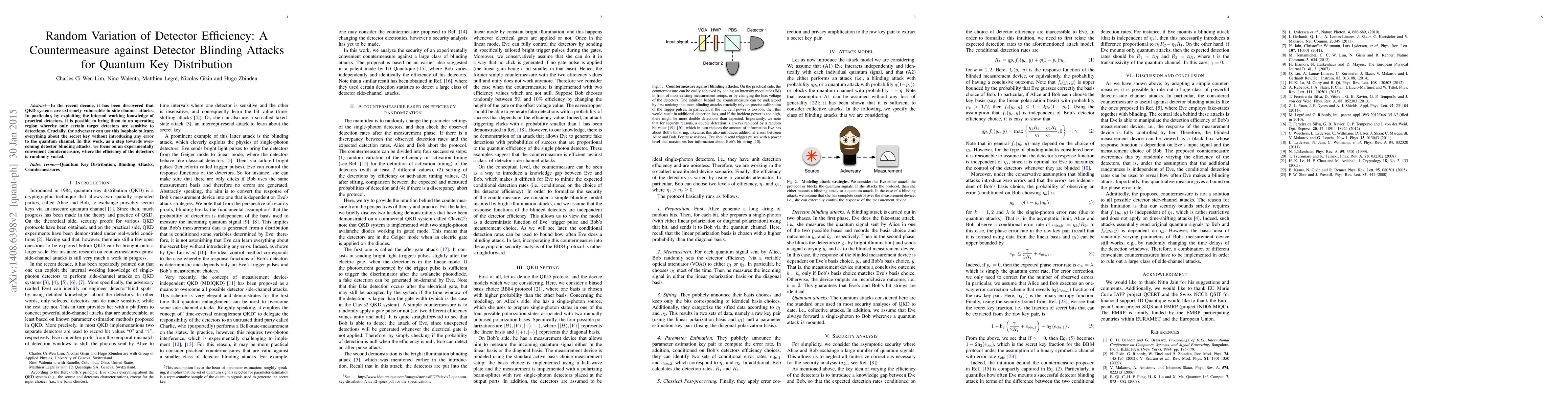 This paper proposes a countermeasure against detector blinding attacks in quantum key distribution (QKD) systems by randomly varying the efficiency of detectors to prevent adversaries from exploiting the internal workings of detectors to gain information about the secret key without introducing errors. This approach aims to enhance the security of QKD against side-channel attacks.