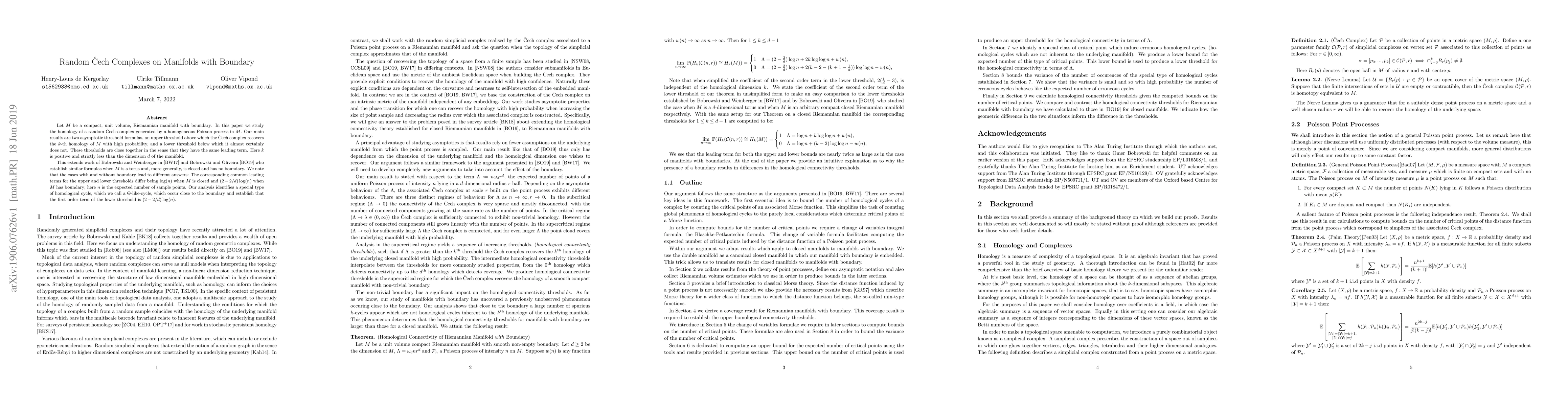 This paper investigates the homology of a random \v{C}ech complex generated by a Poisson process on a compact Riemannian manifold with boundary, establishing asymptotic threshold formulas for when the complex recovers the $k$-th homology with high probability. The thresholds differ for manifolds with and without boundary, with the first-order term of the lower threshold being $(2-2/d)\log(n)$.