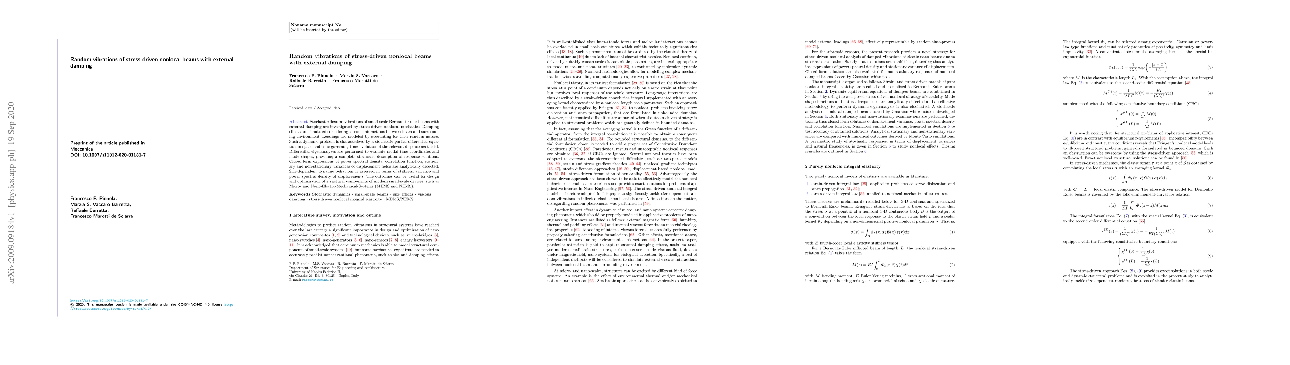 Stochastic flexural vibrations of small-scale Bernoulli-Euler beams with external damping are investigated by stress-driven nonlocal mechanics. Damping effects are simulated considering viscous interactions between beam and surrounding environment. Loadings are modeled by accounting for their random nature. Such a dynamic problem is characterized by a stochastic partial differential equation in space and time governing time-evolution of the relevant displacement field. Differential eigenanalyses are performed to evaluate modal time coordinates and mode shapes, providing a complete stochastic description of response solutions. Closed-form expressions of power spectral density, correlation function, stationary and non-stationary variances of displacement fields are analytically detected. Size-dependent dynamic behaviour is assessed in terms of stiffness, variance and power spectral density of displacements. The outcomes can be useful for design and optimization of structural components of modern small-scale devices, such as Micro- and Nano-Electro-Mechanical-Systems (MEMS and NEMS).