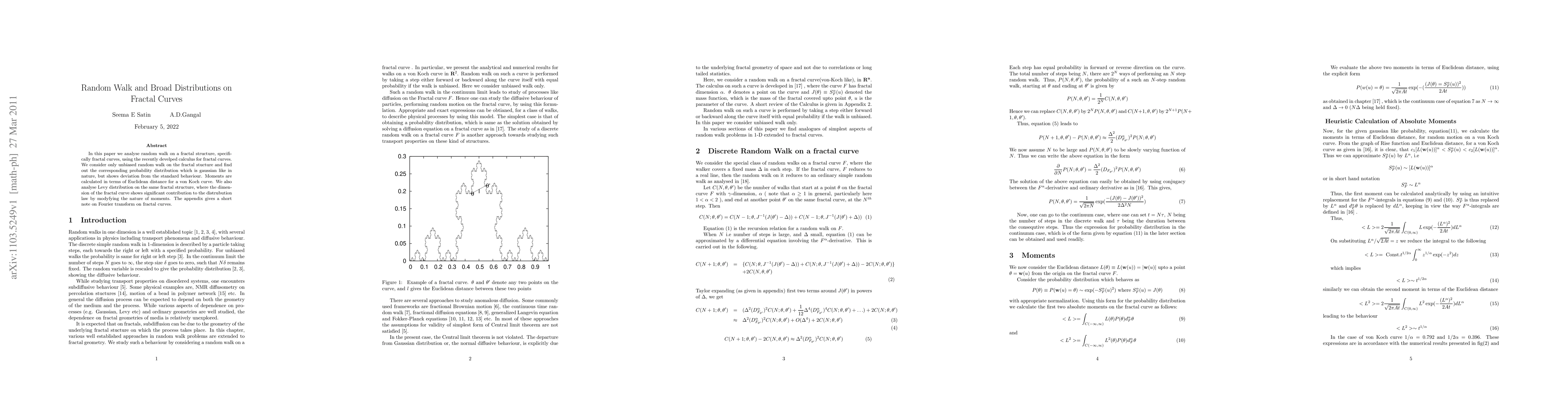 This paper analyzes random walk on fractal curves using a new fractal calculus, revealing a Gaussian-like probability distribution with deviations from standard behavior. It also examines Lévy distributions, showing that fractal dimension significantly influences the distribution's moments, with an appendix discussing Fourier transforms on fractal curves.