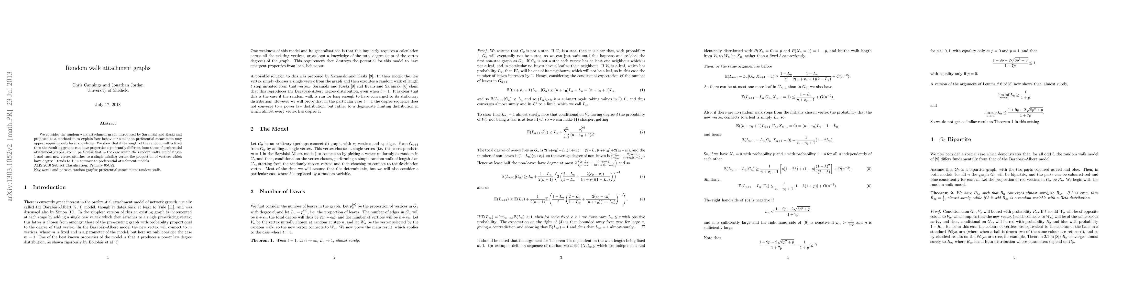 We consider the random walk attachment graph introduced by Saram\"{a}ki and Kaski and proposed as a mechanism to explain how behaviour similar to preferential attachment may appear requiring only local knowledge. We show that if the length of the random walk is fixed then the resulting graphs can have properties significantly different from those of preferential attachment graphs, and in particular that in the case where the random walks are of length 1 and each new vertex attaches to a single existing vertex the proportion of vertices which have degree 1 tends to 1, in contrast to preferential attachment models. AMS 2010 Subject Classification: Primary 05C82. Key words and phrases:random graphs; preferential attachment; random walk.