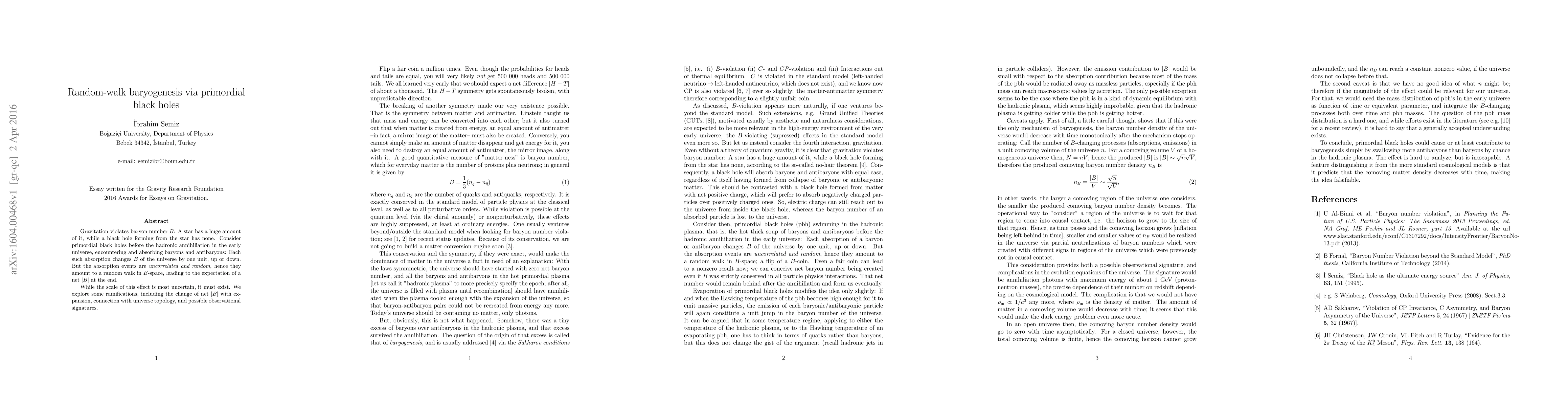 Gravitation violates baryon number $B$: A star has a huge amount of it, while a black hole forming from the star has none. Consider primordial black holes before the hadronic annihiliation in the early universe, encountering and absorbing baryons and antibaryons: Each such absorption changes $B$ of the universe by one unit, up or down. But the absorption events are $uncorrelated$ $and$ $random$, hence they amount to a random walk in $B$-space, leading to the expectation of a net $|B|$ at the end. While the scale of this effect is most uncertain, it must exist. We explore some ramifications, including the change of net $|B|$ with expansion, connection with universe topology, and possible observational signatures.