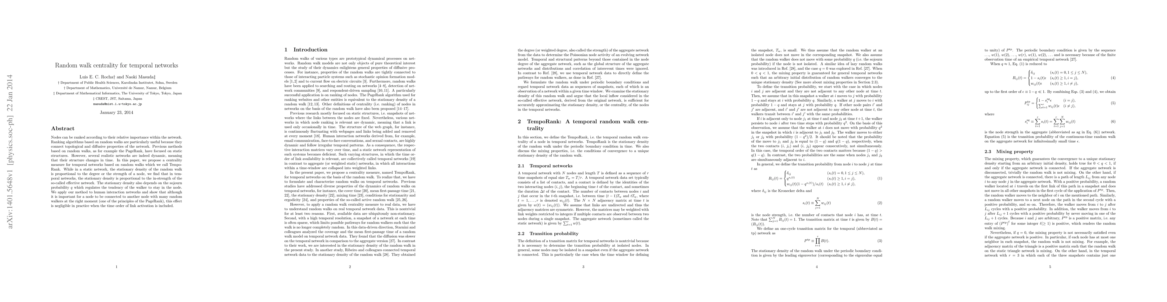 Nodes can be ranked according to their relative importance within the network. Ranking algorithms based on random walks are particularly useful because they connect topological and diffusive properties of the network. Previous methods based on random walks, as for example the PageRank, have focused on static structures. However, several realistic networks are indeed dynamic, meaning that their structure changes in time. In this paper, we propose a centrality measure for temporal networks based on random walks which we call TempoRank. While in a static network, the stationary density of the random walk is proportional to the degree or the strength of a node, we find that in temporal networks, the stationary density is proportional to the in-strength of the so-called effective network. The stationary density also depends on the sojourn probability q which regulates the tendency of the walker to stay in the node. We apply our method to human interaction networks and show that although it is important for a node to be connected to another node with many random walkers at the right moment (one of the principles of the PageRank), this effect is negligible in practice when the time order of link activation is included.