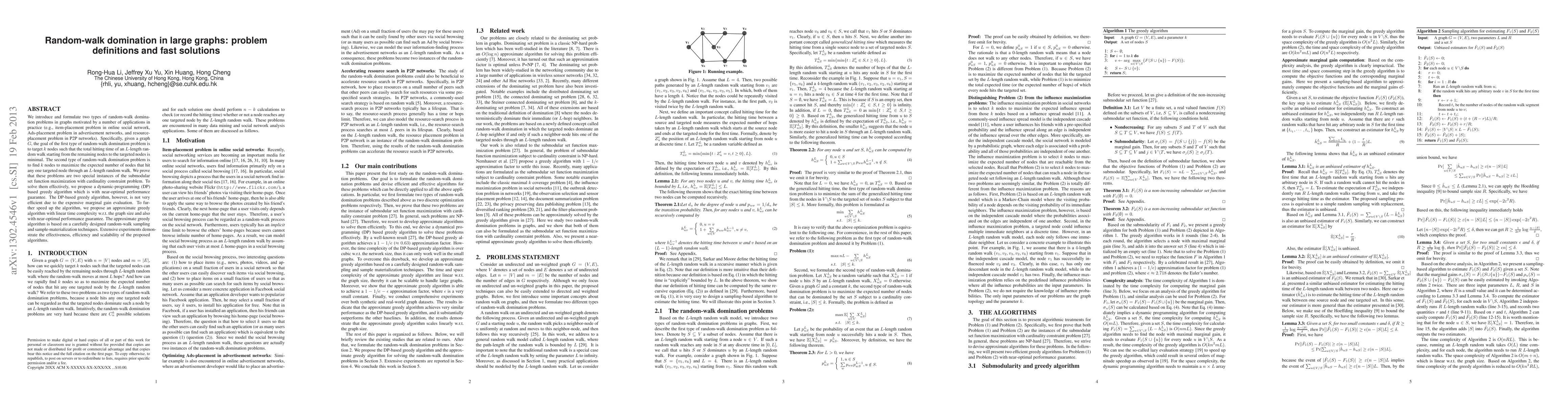 We introduce and formulate two types of random-walk domination problems in graphs motivated by a number of applications in practice (e.g., item-placement problem in online social network, Ads-placement problem in advertisement networks, and resource-placement problem in P2P networks). Specifically, given a graph $G$, the goal of the first type of random-walk domination problem is to target $k$ nodes such that the total hitting time of an $L$-length random walk starting from the remaining nodes to the targeted nodes is minimal. The second type of random-walk domination problem is to find $k$ nodes to maximize the expected number of nodes that hit any one targeted node through an $L$-length random walk. We prove that these problems are two special instances of the submodular set function maximization with cardinality constraint problem. To solve them effectively, we propose a dynamic-programming (DP) based greedy algorithm which is with near-optimal performance guarantee. The DP-based greedy algorithm, however, is not very efficient due to the expensive marginal gain evaluation. To further speed up the algorithm, we propose an approximate greedy algorithm with linear time complexity w.r.t.\ the graph size and also with near-optimal performance guarantee. The approximate greedy algorithm is based on a carefully designed random-walk sampling and sample-materialization techniques. Extensive experiments demonstrate the effectiveness, efficiency and scalability of the proposed algorithms.