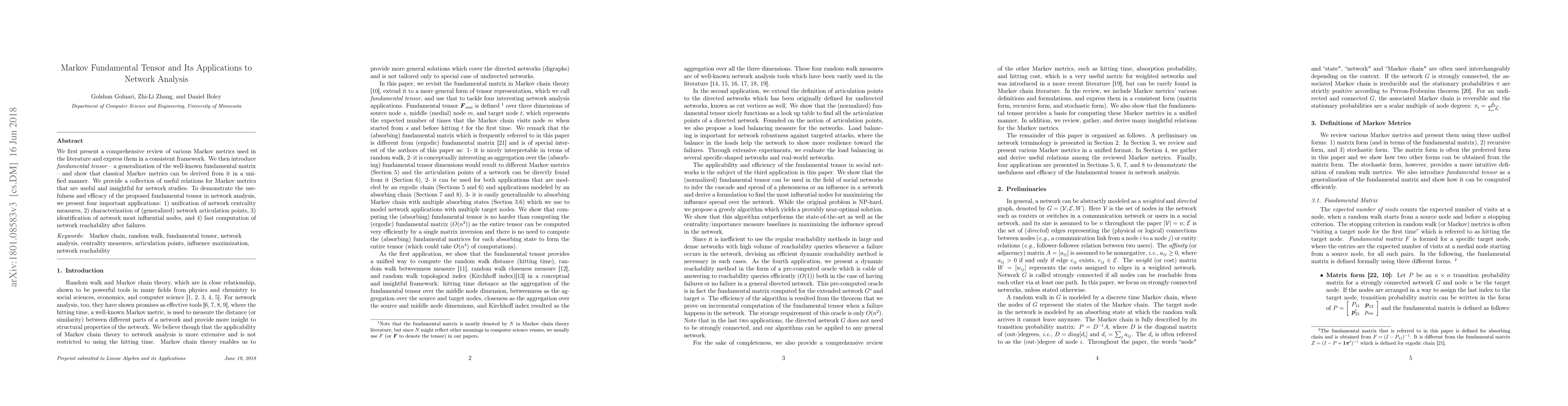 This paper reviews random walk metrics and introduces a fundamental tensor to unify these metrics. It demonstrates the tensor's utility in network analysis through applications including network centrality, articulation points, influential node identification, and reachability computation after failures.