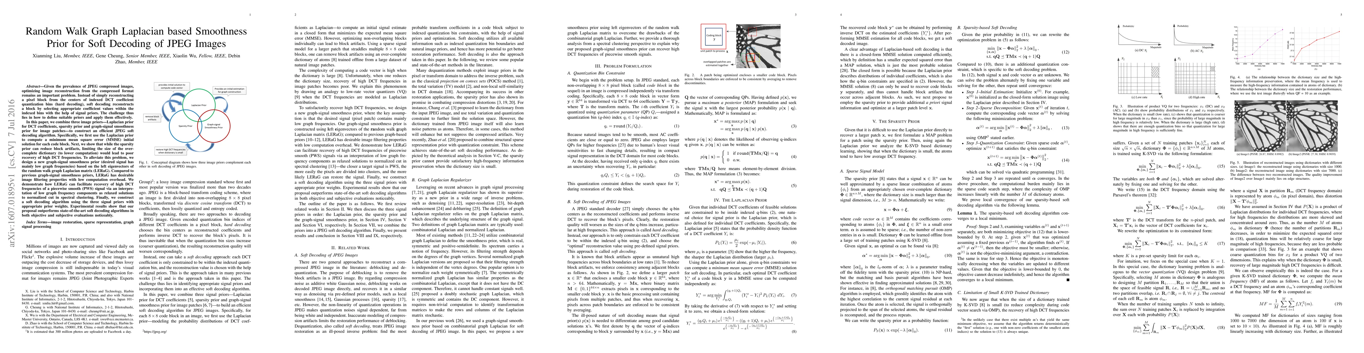 This paper proposes a JPEG soft decoding algorithm that combines Laplacian, sparsity, and graph-signal smoothness priors to reconstruct images from compressed formats. It introduces a novel graph-signal smoothness prior based on the left eigenvectors of the random walk graph Laplacian matrix (LERaG) to effectively recover high DCT frequencies while maintaining low computational overhead, outperforming existing methods in both objective and subjective evaluations.