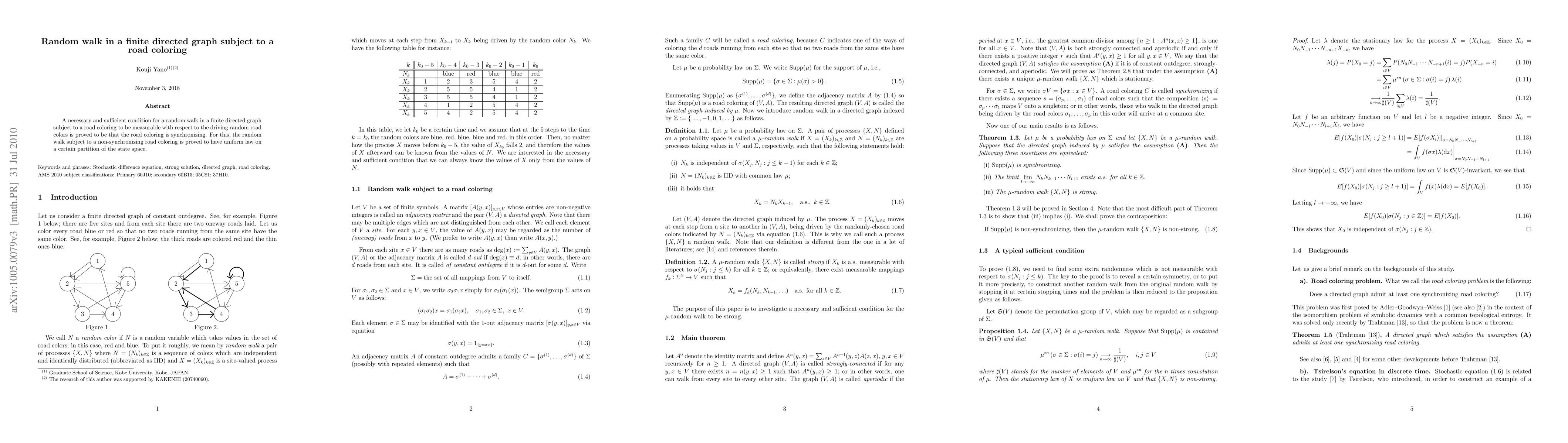 Summary: The paper establishes a necessary and sufficient condition for a random walk in a directed graph with road coloring to be measurable, proving that synchronization of the road coloring is essential. It also demonstrates that non-synchronizing road colorings lead to uniform law distribution across a state space partition.