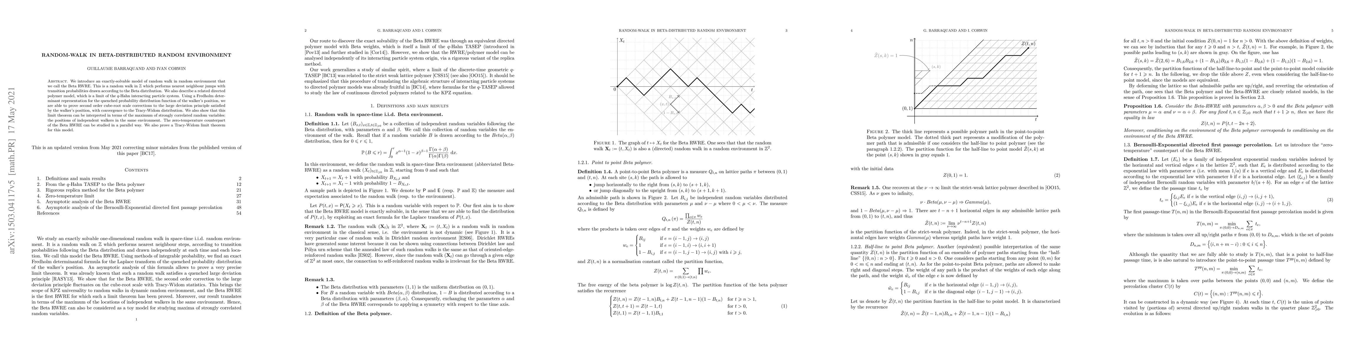 This paper introduces a solvable random walk model in a Beta-distributed random environment, demonstrating second-order corrections to its large deviation principle and showing convergence to the Tracy-Widom distribution. It also establishes a Tracy-Widom limit theorem for the zero-temperature version of the model.