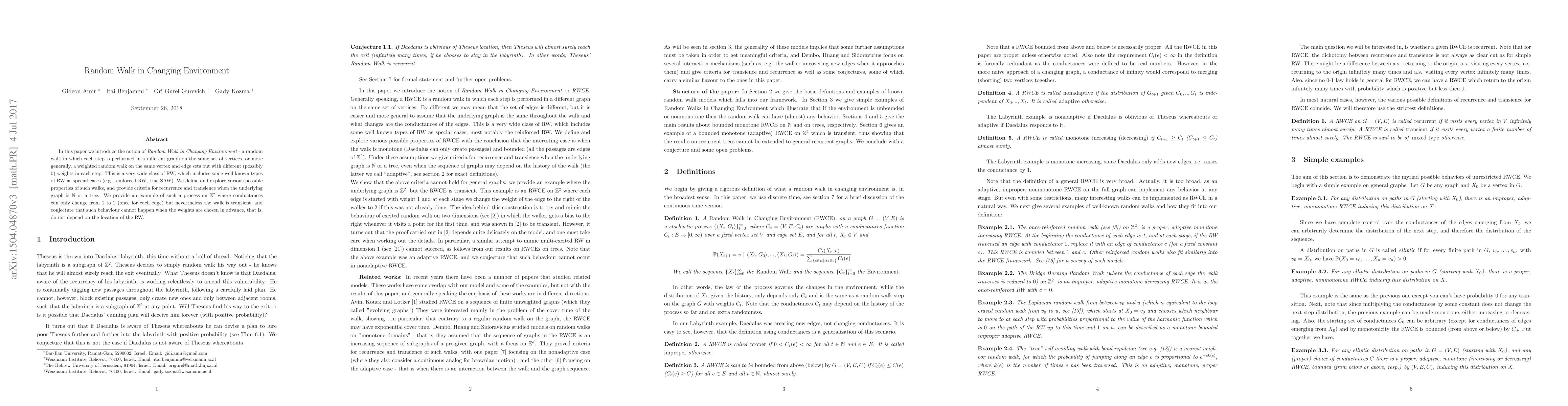 This paper explores Random Walk in Changing Environment, a versatile model where each step occurs on a different graph or with varying weights. It investigates properties, recurrence, and transience criteria, and provides a transient example on $\mathbb{Z}^2$ with specific weight changes, while hypothesizing that pre-chosen weights prevent such transient behavior.