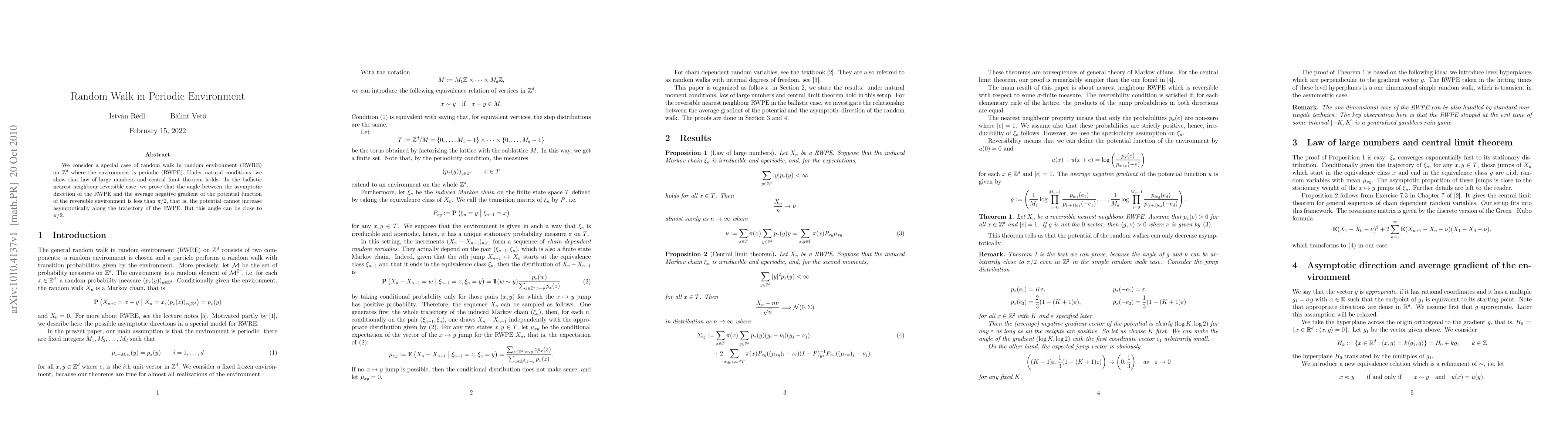 We consider a special case of random walk in random environment (RWRE) on Z^d where the environment is periodic (RWPE). Under natural conditions, we show that law of large numbers and central limit theorem holds. In the ballistic nearest neighbour reversible case, we prove that the angle between the asymptotic direction of the RWPE and the average negative gradient of the potential function of the reversible environment is less than pi/2, that is, the potential cannot increase asymptotically along the trajectory of the RWPE. But this angle can be close to pi/2.