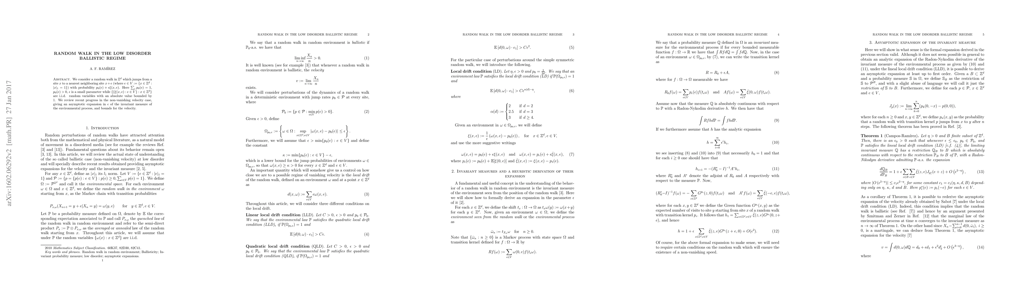 We consider a random walk in $\mathbb Z^d$ which jumps from a site $x$ to a nearest neighboring site $x+e$ (where $e\in V:=\{x\in\mathbb Z^d: |x|_1=1\}$) with probability $p_0(e)+\epsilon\xi(x,e)$. Here $\sum_e p_0(e)=1$, $p_0(e)> 0$, $\epsilon$ is a small parameter while $\{\{\xi (x,e):e\in V\}: x\in\mathbb Z^d\}$ are i.i.d. random variables with an absolute value bounded by $1$. We review recent progress in the non-vanishing velocity case, giving an asymptotic expansion in $\epsilon$ of the invariant measure of the environmental process, and bounds for the velocity.