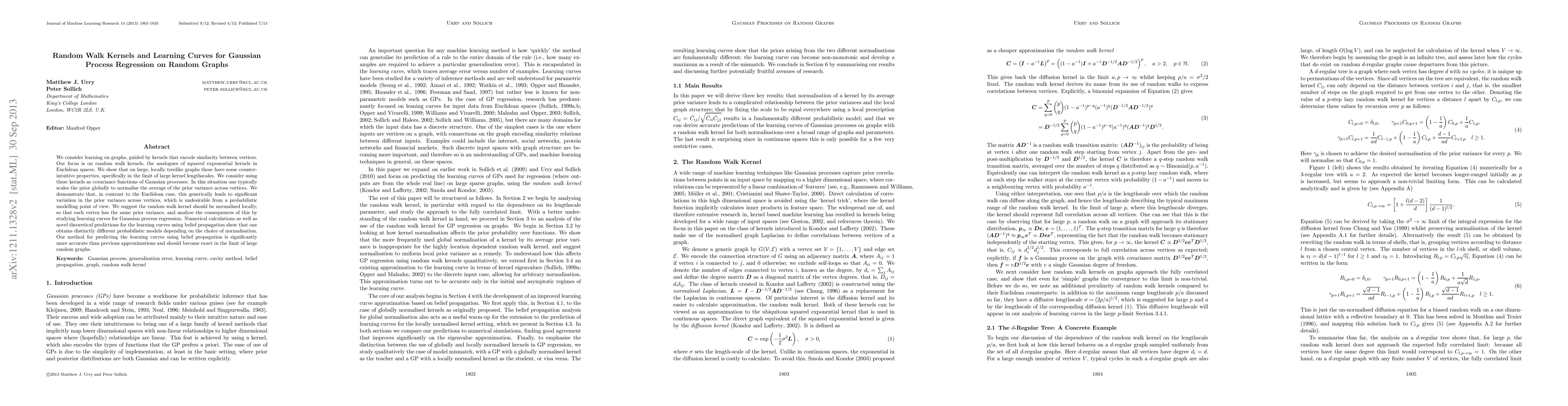 This paper investigates the use of random walk kernels for learning on large, locally treelike graphs, showing that global scaling of these kernels leads to undesirable variance variation across vertices. The authors propose local normalization to achieve uniform prior variance and analyze the impact on Gaussian process regression learning curves, demonstrating improved accuracy using belief propagation.