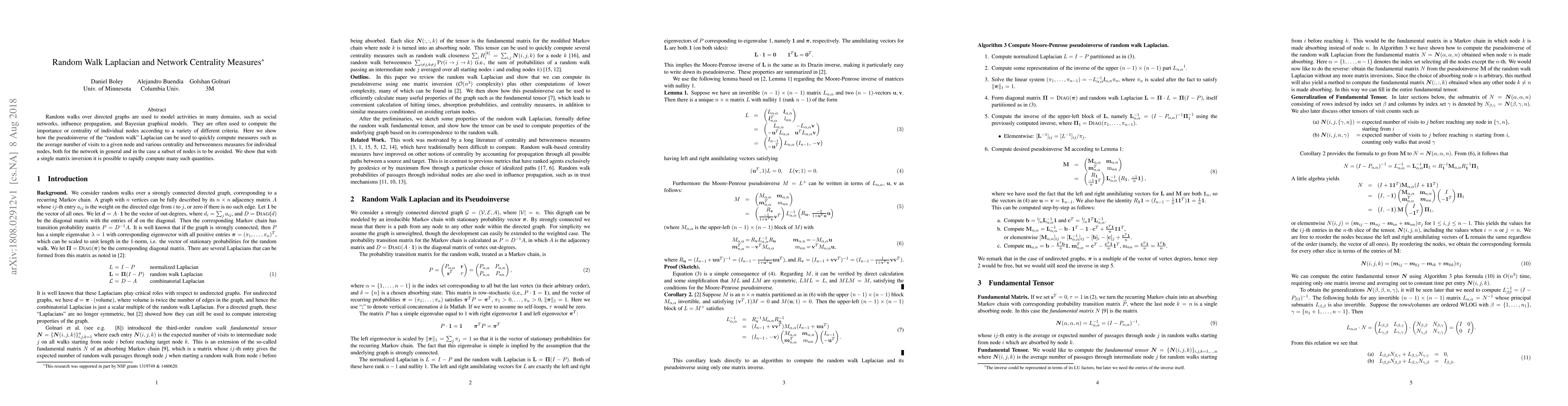 Random walks over directed graphs are used to model activities in many domains, such as social networks, influence propagation, and Bayesian graphical models. They are often used to compute the importance or centrality of individual nodes according to a variety of different criteria. Here we show how the pseudoinverse of the "random walk" Laplacian can be used to quickly compute measures such as the average number of visits to a given node and various centrality and betweenness measures for individual nodes, both for the network in general and in the case a subset of nodes is to be avoided. We show that with a single matrix inversion it is possible to rapidly compute many such quantities.