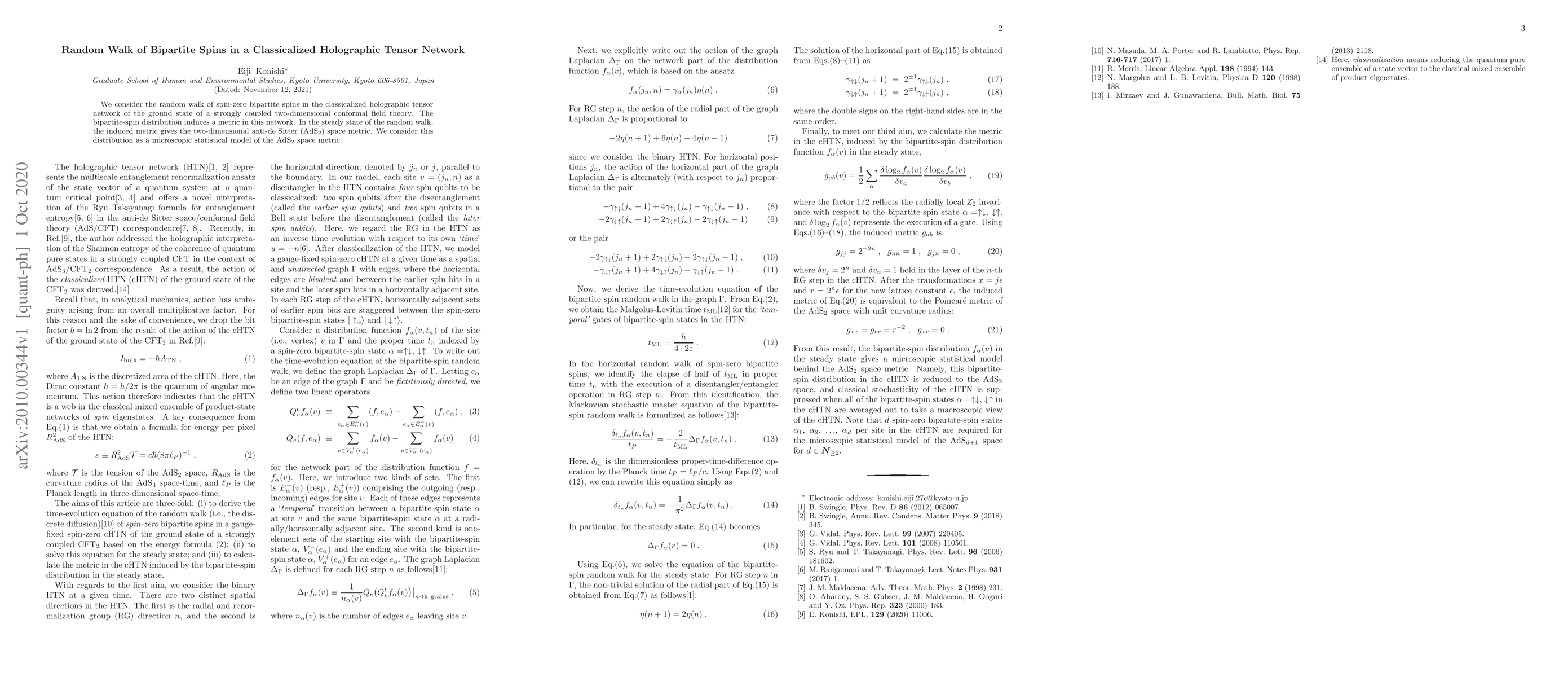 We consider the random walk of spin-zero bipartite spins in the classicalized holographic tensor network of the ground state of a strongly coupled two-dimensional conformal field theory. The bipartite-spin distribution induces a metric in this network. In the steady state of the random walk, the induced metric gives the two-dimensional anti-de Sitter (AdS$_2$) space metric. We consider this distribution as a microscopic statistical model of the AdS$_2$ space metric.